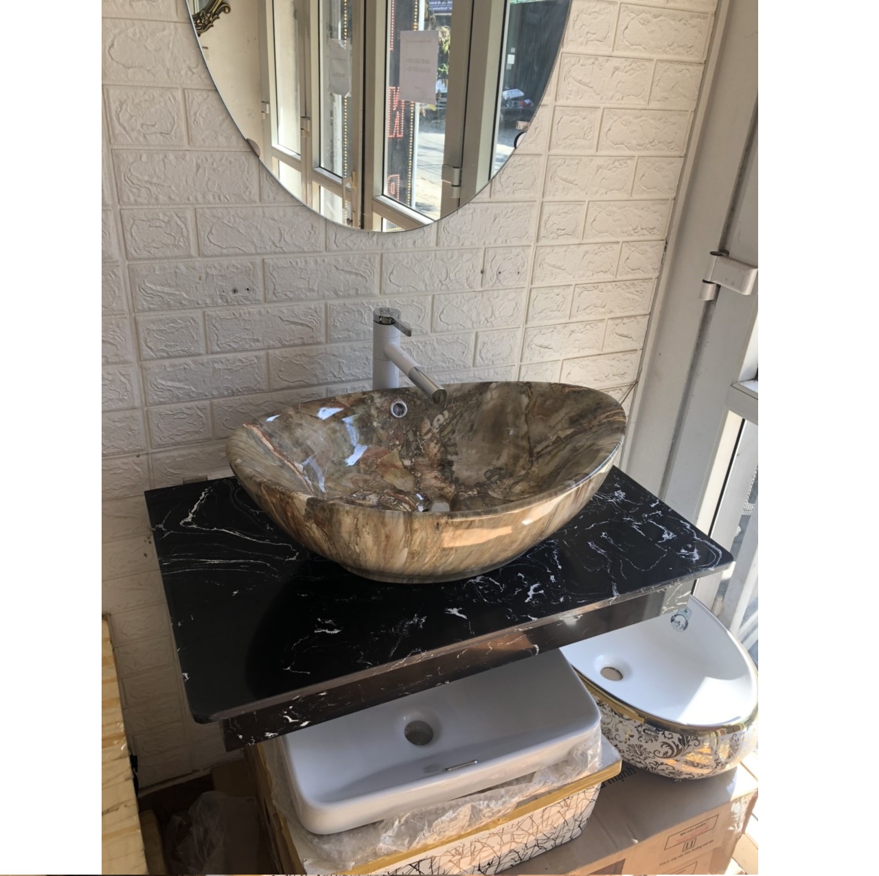 Combo lavabo chậu thuyền trắng + vòi trắng hoa vàng 30F + bàn đá vân mây chống xước cao cấp