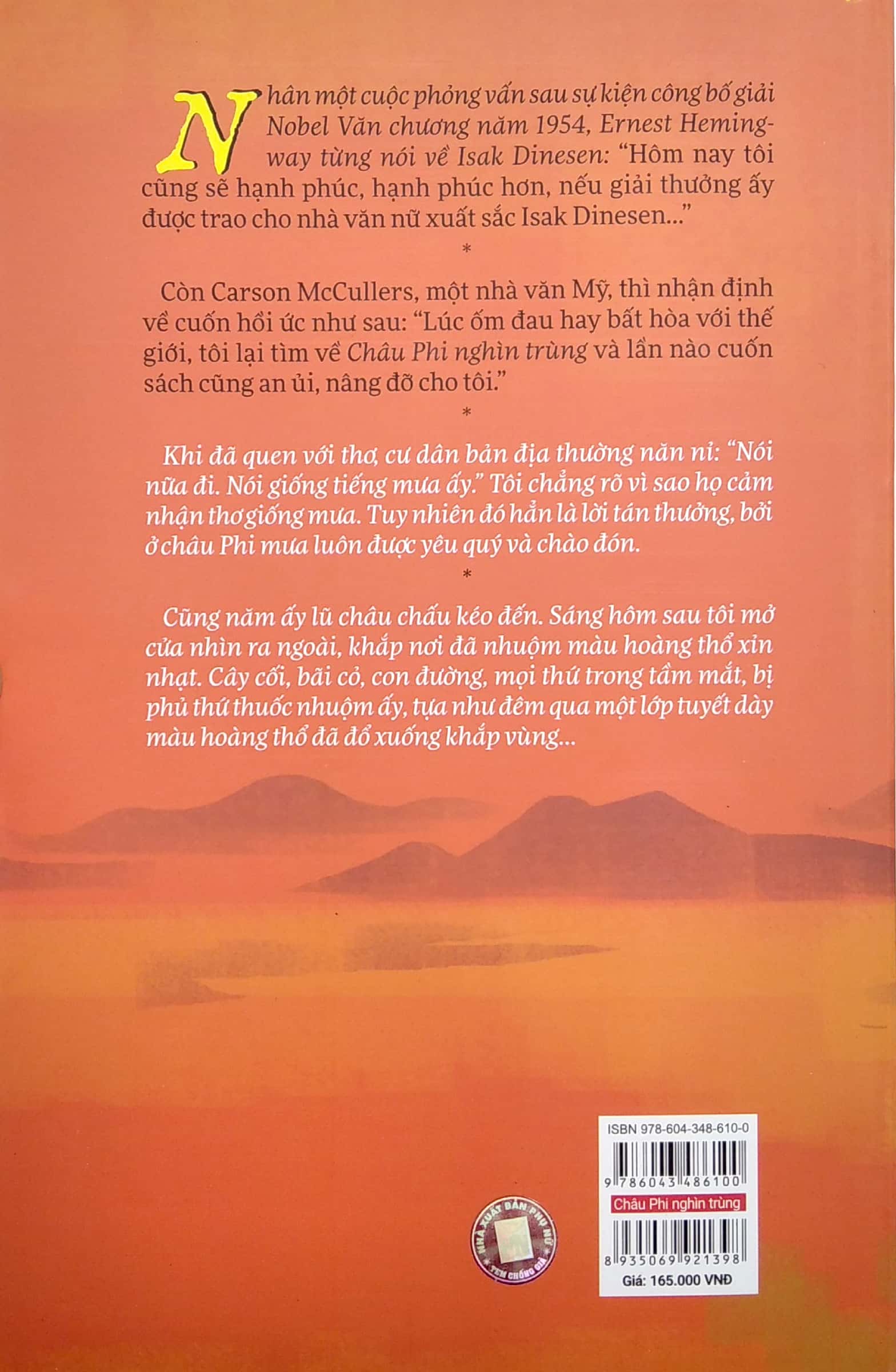 Châu Phi nghìn trùng – tác phẩm ra đời từ những trải nghiệm cá nhân của một con người, nhưng lại mở cho chúng ta cánh cửa tới châu Phi rộng lớn: Có thiên nhiên hoang dã, khoáng đạt, trao tặng nhiều song lấy đi cũng cực kì tàn nhẫn; có con người “nguyên sơ” lắm lúc đến mức khôi hài và cũng thật đáng yêu. Qua cuốn hồi ức, châu Phi hiện lên lạ lùng trong mối tương giao giữa cái bản địa và thực dân da trắng, từ góc nhìn khác biệt, không khinh khi, xa cách mà ẩn chứa tình yêu.