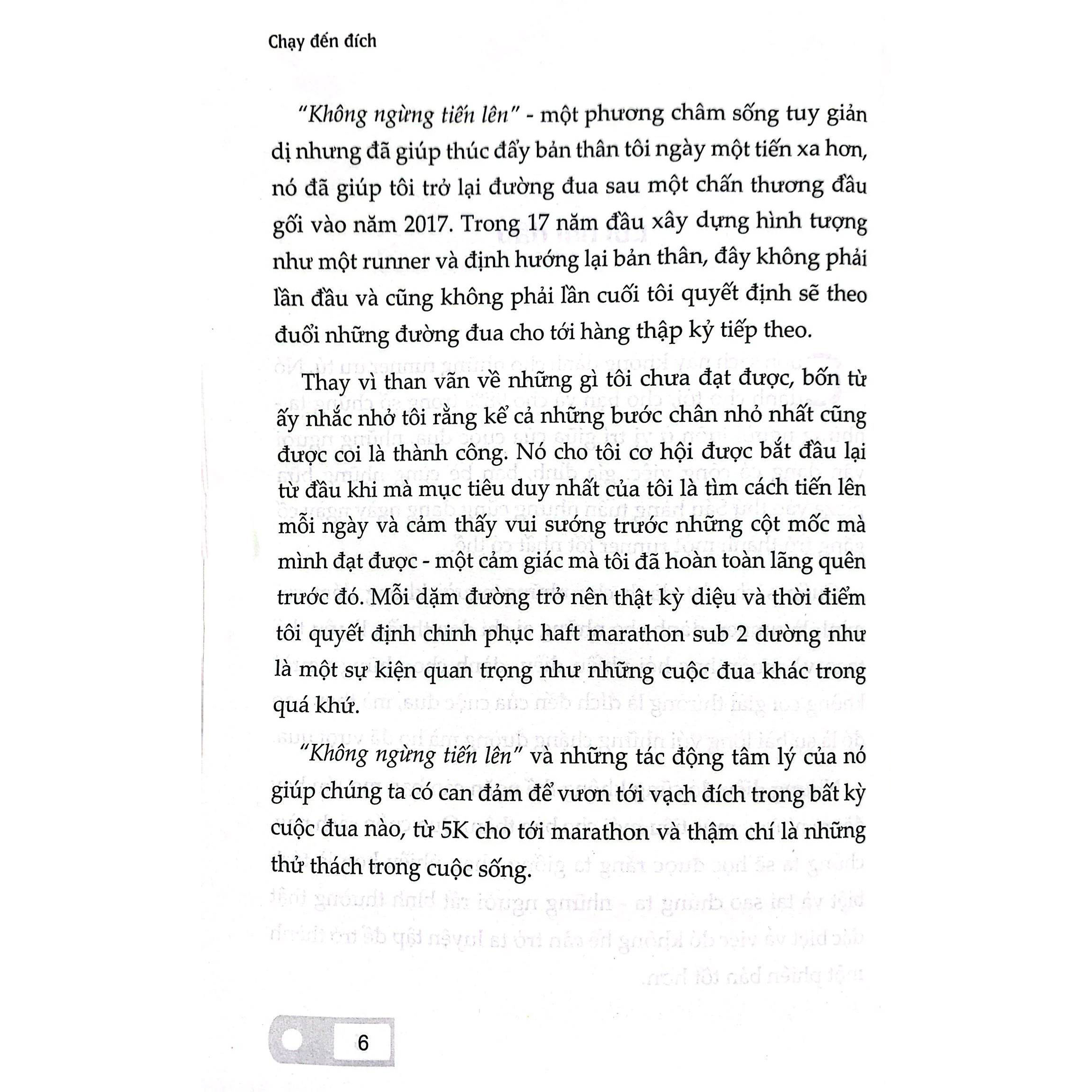 “Chạy đến đích” không phải là một cuốn sách về chạy bộ thông thường. Không chỉ chứa đựng những lời khuyên bổ ích về việc lên kế hoạch rèn luyện, mà trên hết, cuốn sách này sẽ cho bạn biết cách hài lòng với bản thân và đặt tình yêu vào các cung đường đua mà không cần so sánh bản thân với những người khác. Những lời khuyên thiết thực về việc làm sao để thấu hiểu những khó khăn và đau đớn, sức mạnh tinh thần chạy bộ hay các bước giúp phục hồi những chấn thương phổ biến nhất trong chạy bộ được viết với một giọng văn hóm hỉnh. Amanda Brooks như một người bạn chân thành, truyền cảm hứng cho tất cả những ai muốn trở nên hạnh phúc hơn thông qua chạy bộ.