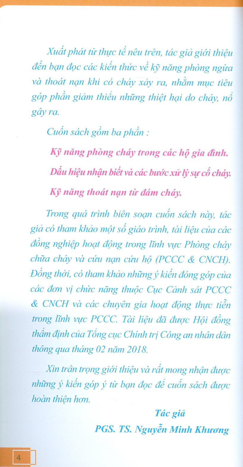Trong quá trình biên soạn cuốn sách này, tác giả có tham khảo một số giáo trình, tài liệu của các đồng nghiệp hoạt động trong lĩnh vực PCCC và CNCH. Đồng thời, có tham khảo những ý kiến đóng góp của các đơn vị chức năng thuộc Cục Cảnh sát PCCC & CNCH và các chuyên gia hoạt động thực tiễn trong lĩnh vực PCCC. Tài liệu đã được Hội đồng thẩm định của Tổng cục Chính trị Công an nhân dân thông qua tháng 02 năm 2018.