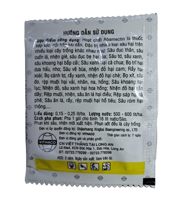 - Cách pha phun: pha 1 gói cho bình 16 lit nước/sào. Phun khi sâu, nhện, rầy, bọ, rệp, mới xuất hiện trên cây trồng. Phun đều ướt lá. Lưu ý: