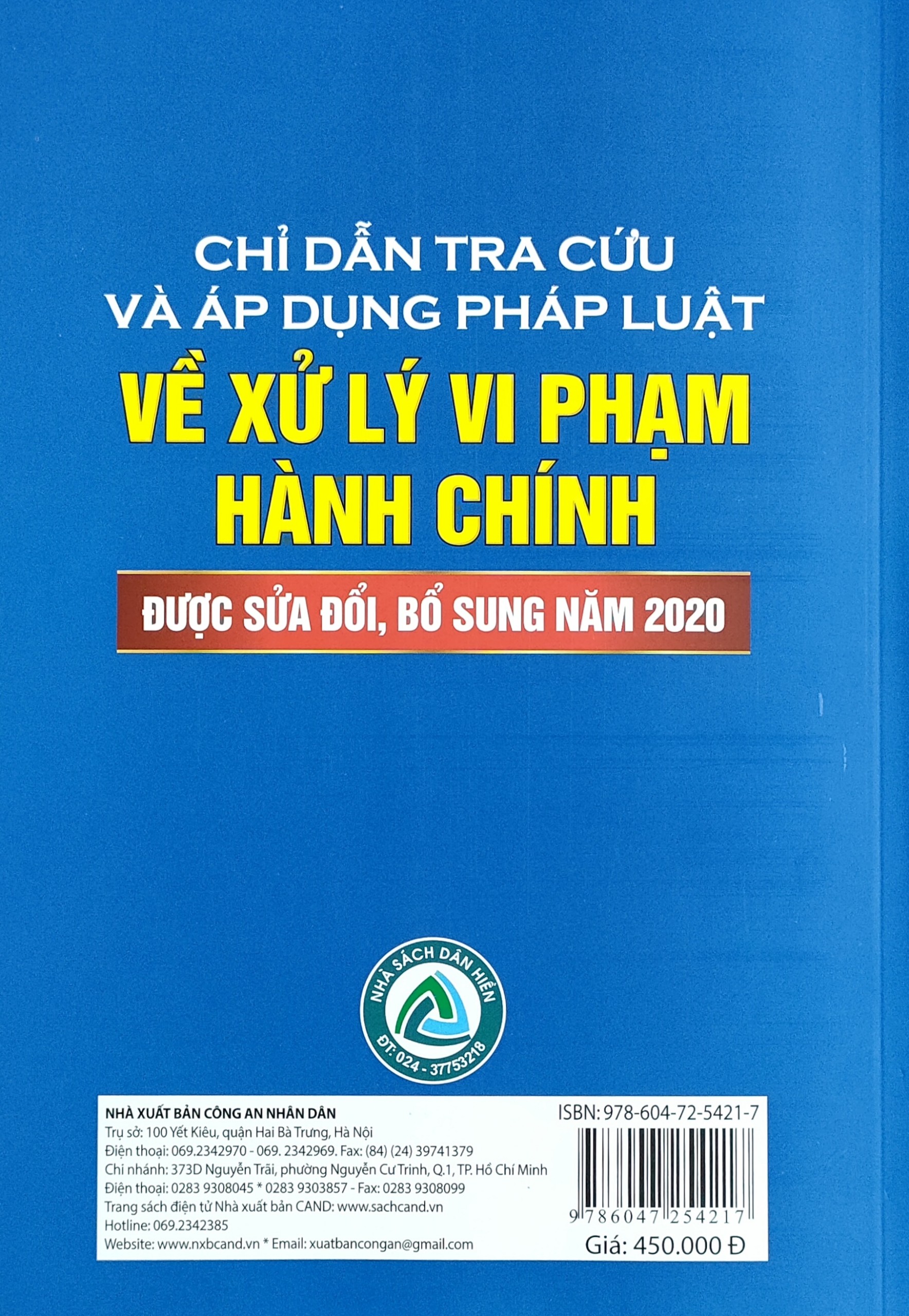 Luật xử lý vi phạm hành chính số 15/2012/QH13 ngày 20 tháng 06 năm 2012 của Quốc hội, có hiệu lực kể từ ngày 01 tháng 07 năm 2013, được sửa đổi, bổ sung bởi Luật Xử lý vi phạm hành chính năm 2021 có hiệu lực kể từ ngày 01 tháng 01 năm 2022 Để tiện tra cứu và áp dụng pháp luật về xử lý vi phạm hành chính, nhóm tác giả đã biên soạn bộ sách: "Chỉ dẫn tra cứu và áp dụng pháp luật về xử lý vi phạm hành chính (được sửa đổi, bổ sung năm 2020)", ngoài lời giới thiệu, danh mục văn bản chỉ dẫn tra cứu và áp dụng pháp luật về xử lý vi phạm hành chính, bộ sách gồm 02 phần và được chia làm 02 quyển: Phần A: Chỉ dẫn tra cứu và áp dụng pháp luật về xử lý vi phạm hành chính chung cho mọi lĩnh vực
