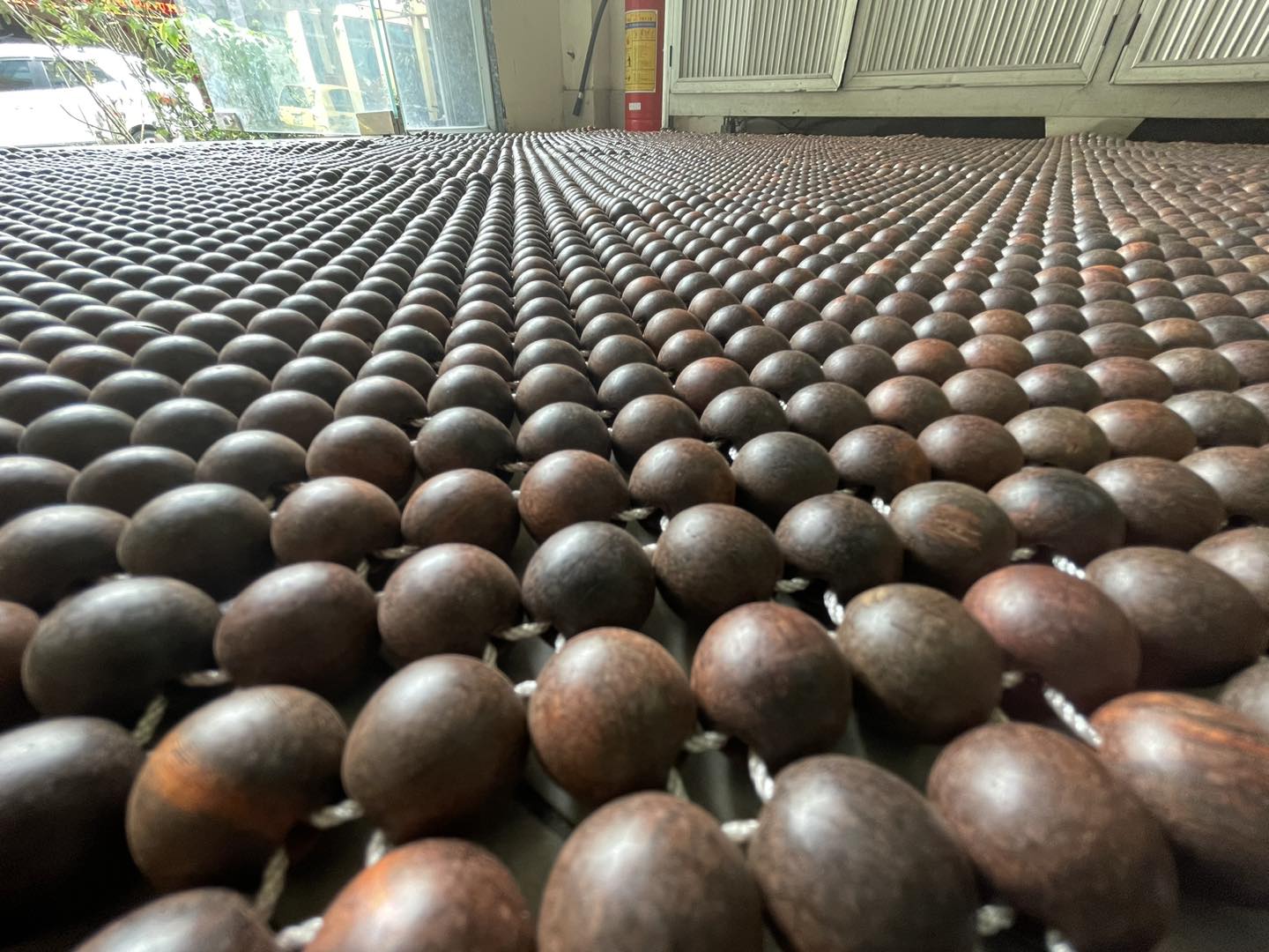CHIẾU HẠT GỖ HƯƠNG ĐỎ  CAO CẤP ( ) : - Chất liệu : 100% gỗ Hương  tự nhiên - Kích thước chiếu : 2,2mx2m - Kích thước hạt : 1,2cm ( kích thước hạt
