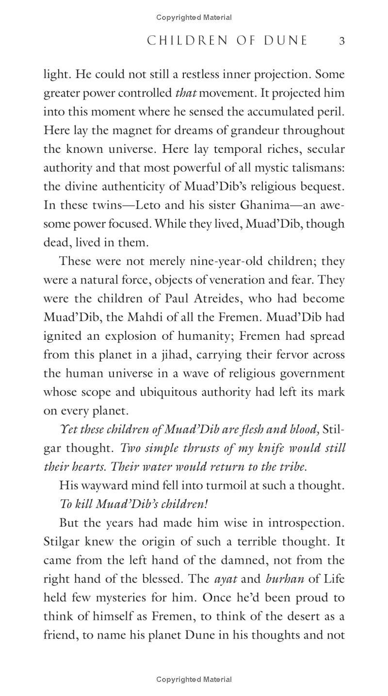 The Children of Dune are twin siblings Leto and Ghanima Atreides, whose father, the Emperor Paul Muad’Dib, disappeared in the desert wastelands of Arrakis nine years ago. Like their father, the twins possess supernormal abilities—making them valuable to their manipulative aunt Alia, who rules the Empire in the name of House Atreides.