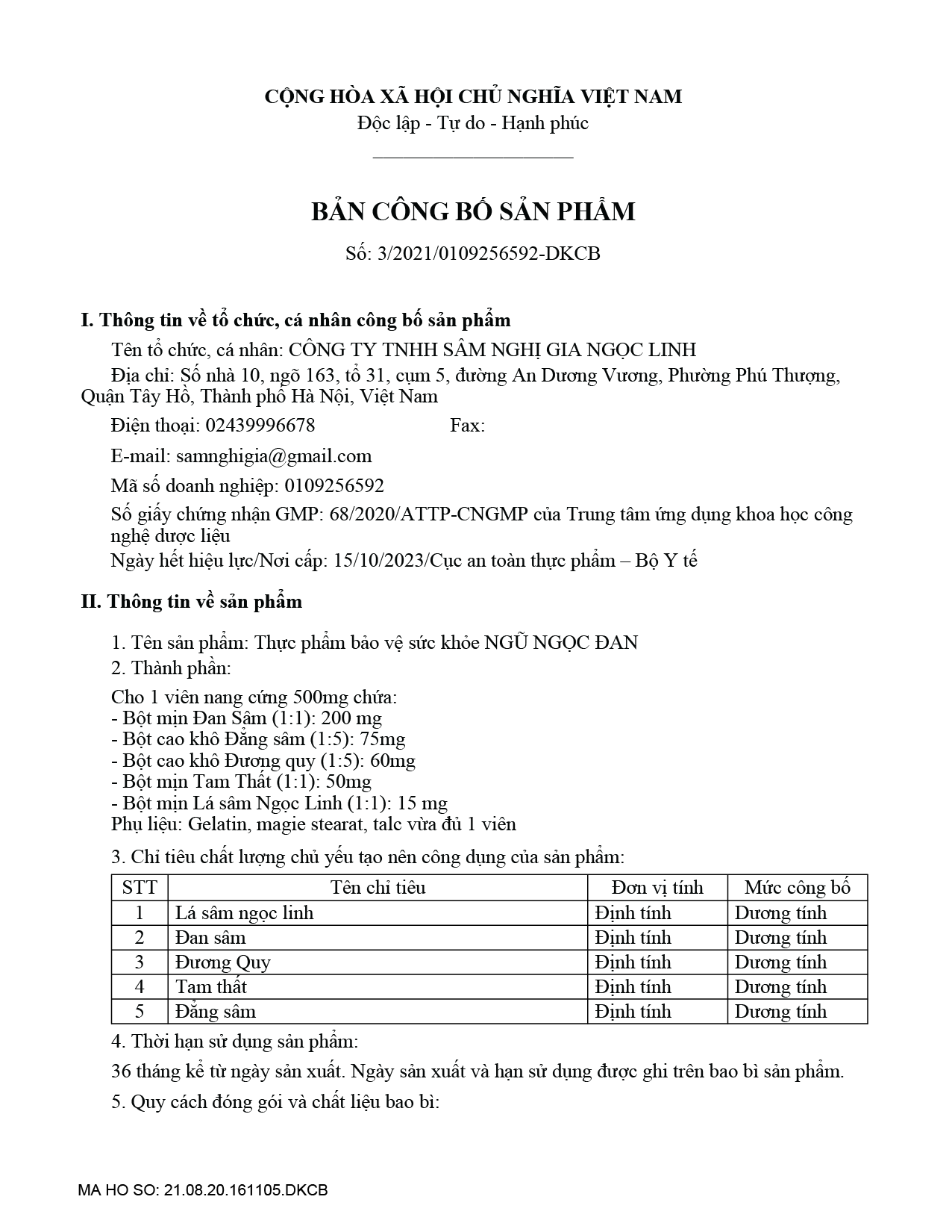 Thành phần: Cho 1 viên nang cứng 500mg chứa: Bột mịn Đan Sâm (1:1) 200mg; Bột cao khô Đẳng sâm (1:5) 75mg; Bột cao khô Đương quy (1:5) 60mg; Bột mịn Tam Thất (1:1) 50mg; Bột mịn Lá sâm Ngọc Linh (1:1) 15 mg; Phụ liệu: Gelatin, Magie Stearat, Talc vừa đủ 1 viên.