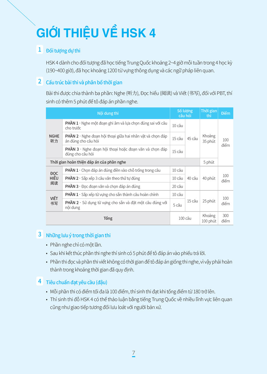 Ở phần đầu sách sẽ giới thiệu về đề thi HSK 4 bao gồm đối tượng dự thi, cấu trúc bài thi và phân bổ thời gian, những lưu ý trong thời gian thi, tiêu chuẩn để đạt yêu cầu và cách viết phiếu trả lời HSK 4