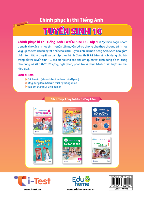 Mua tại TiktokChinh phục kì thi Tiếng Anh - Tuyển sinh 10 tập 1 được biên soạn nhằm trang bị cho các em học sinh nguồn tài nguyên bổ trợ phong phú theo chương trình học và giúp các em chuẩn bị tốt nhất cho kì thi tuyển sinh lớp 10 môn tiếng Anh. Sách bao gồm phần tóm tắt lý thuyết và bài tập thực hành được thiết kế bám sát các dạng câu hỏi trong đề thi tuyển sinh lớp 10, tạo cơ hội cho các em làm quen với các định dạng đề thi cũng như củng cố kiến thức từ vựng, ngữ pháp, phát âm và thực hành các chiến lược làm bài một cách hiệu quả.