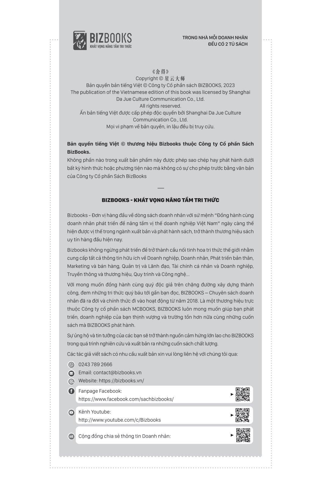 Mua tại TiktokCho Là Nhận - Tu Thân Sự sống vô hạn vượt qua thời gian, ánh sáng vô hạn vượt qua không gian. Cơ thể con người có sinh có diệt, nhưng sinh mệnh thật sự luôn bất tử. Mỗi con người chúng ta đều có một sinh mệnh bất tử, đó chính là con người thật của chúng ta! Với cuốn sách Cho là nhận: Tu Thân, nội dung quan trọng của nó chính là cái bên trong của con người, liên quan đến việc tu dưỡng đạo đức, gọt giũa tầm nhìn và rèn luyện được tính biết kiềm chế, buông bỏ sân hận. Từ đó, bạn có thể xác lập tâm thế bên trong khi tiến hành đối đãi với những người và những sự việc trong xã hội. Cuốn sách gồm có 4 chương chính Chương 1: Được người khác lợi dụng mới có giá trị Chương 2: Đồng nát sắt vụn cũng có thể luyện thành thép Chương 3: Kiên nhẫn làm người Chương 4: Cho đi chính là nhận về, đứng thẳng khom lưng thật dễ dàng Cuộc đời con người, thời kì này trôi qua sẽ có thời kì khác, thậm chí là vô hạn. Giống như cây hoa, dù héo tàn điêu linh, chỉ cần hạt giống còn ở lại ắt sẽ có mùa hoa nở thứ hai, thứ ba thậm chí là mùa hoa nở vô hạn cùng cuộc sống vô lượng. Cuộc đời là sự tổng hòa của nhiều hương vị phức tạp
