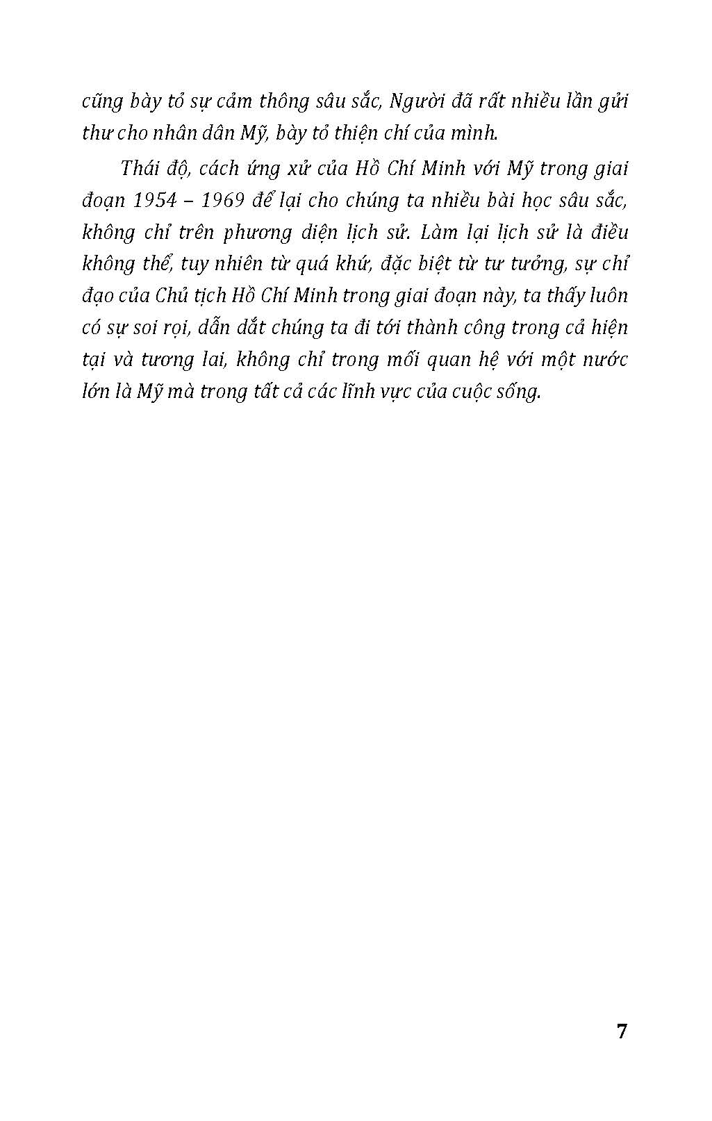 Mua tại TiktokThái độ, cách ứng xử của Hồ Chí Minh với Mỹ trong giai đoạn 1954 – 1969 để lại cho chúng ta nhiều bài học sâu sắc, không chỉ trên phương diện lịch sử. Làm lại lịch sử là điều không thể, tuy nhiên từ quá khứ, đặc biệt từ tư tưởng, sự chỉ đạo của Chủ tịch Hồ Chí Minh trong giai đoạn này, ta thấy luôn có sự soi rọi, dẫn dắt chúng ta đi tới thành công trong cả hiện tại và tương lai, không chỉ trong mối quan hệ với một nước lớn là Mỹ mà trong tất cả các lĩnh vực của cuộc sống.