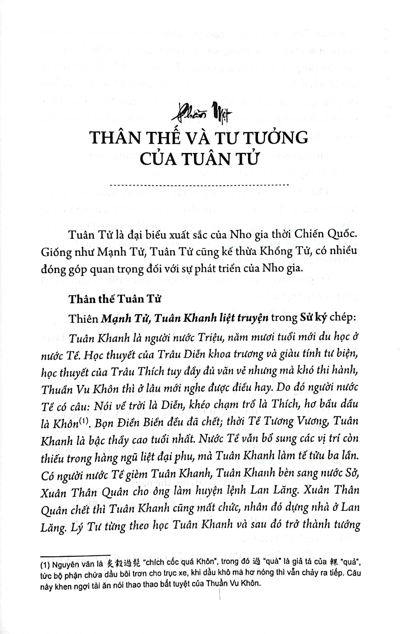Tuân Tử là đại biểu xuất sắc của Nho gia thời Chiến Quốc. Giống như Mạnh Tử, Tuân Tử cũng kế thừa Khổng Tử, có nhiều đóng góp quan trọng đối với sự phát triển của Nho gia. Nếu như ví Khổng Tử với Socrate ở phương Tây, vậy thì Mạnh Tử sẽ là Plato, còn Tuân Tử chính là Aristotle. Ông là một nhà nho khá đặc biệt trong lịch sử nho học, cũng là một nhà nho gây ra nhiều tranh cãi, thậm chí còn bị chối bỏ. Song tư tưởng của Tuân Tử rất mới mẻ và độc đáo, không câu nệ điều gì, cũng không dựa vách người xưa. Và như cụ Phan Bội Châu đã nói, “chúng ta đối với Tuân, sở dĩ đáng kính phục, đáng sùng bái là vì chốn ấy; nhưng hậu nho sở dĩ hay công kích thầy Tuân cũng vì chốn ấy”.