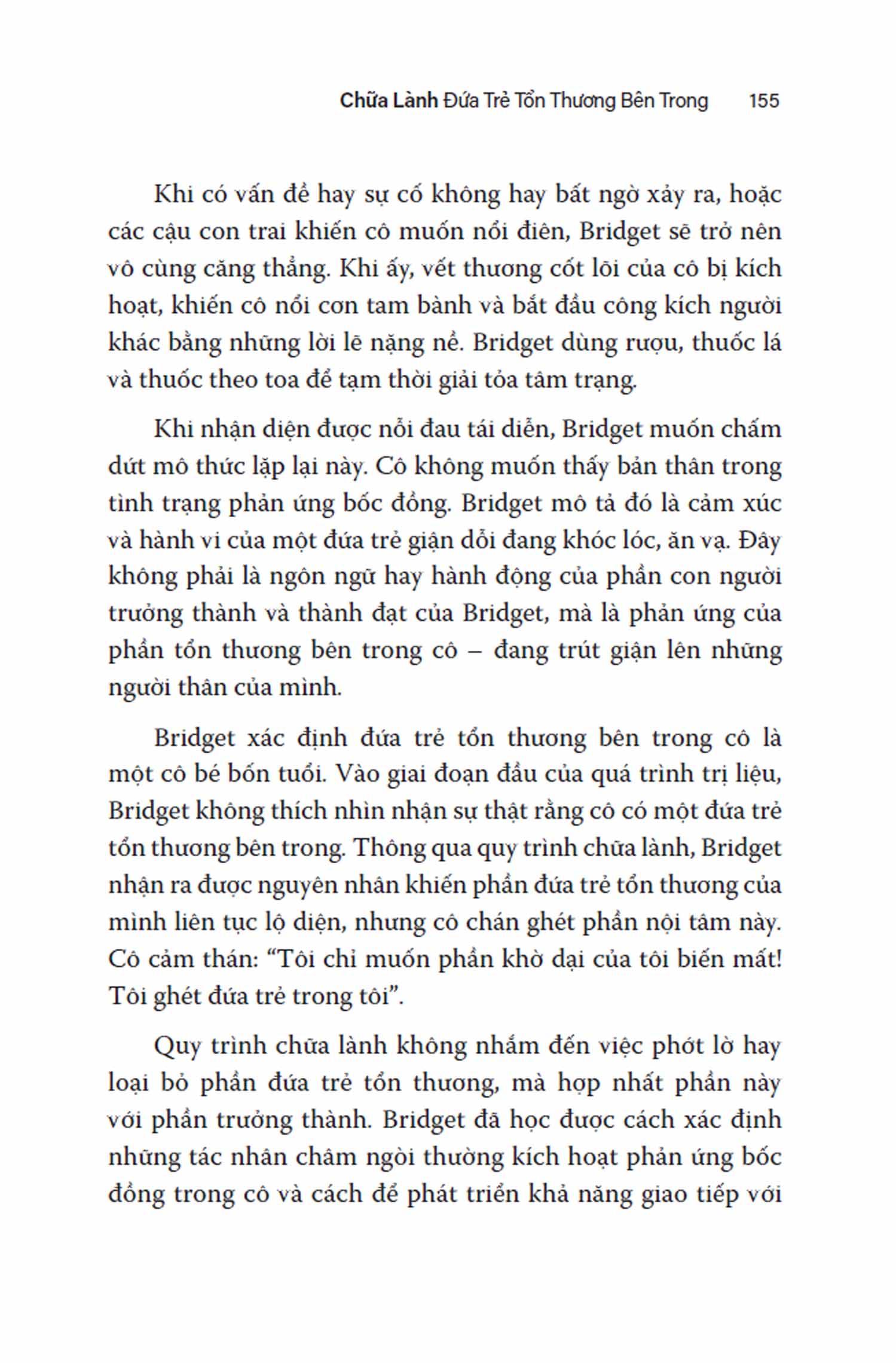 Thông qua các bài tập và câu chuyện của những người đã được chữa lành cũng như của chính tác giả, cuốn sách hướng dẫn làm thế nào để thấu hiểu “đứa trẻ tổn thương” bên trong chính m.ình và cách để kết nối phần nội tâm này với “phần trưởng thành”. Chẳng hạn như nhìn lại dòng sự kiện thời thơ ấu, viết thư trao đổi giữa phần trưởng thành và phần tổn thương, liên hệ những phản ứng bốc đồng trong hiện tại với nguyên nhân trong quá khứ… Việc viết những lá thư chữa lành qua lại với chính m.ình là một cách tuyệt vời để nhanh chóng làm bộc lộ những cảm xúc và kết nối với phần tổn thương bên trong bạn. Bạn đọc cũng sẽ hiểu cách mà “phần người lớn có trách nhiệm” có thể phát triển một bộ công cụ hồi đáp mới, tích cực hơn, thay thế cho những kiểu phản ứng cũ của đứa trẻ tổn thương bên trong.