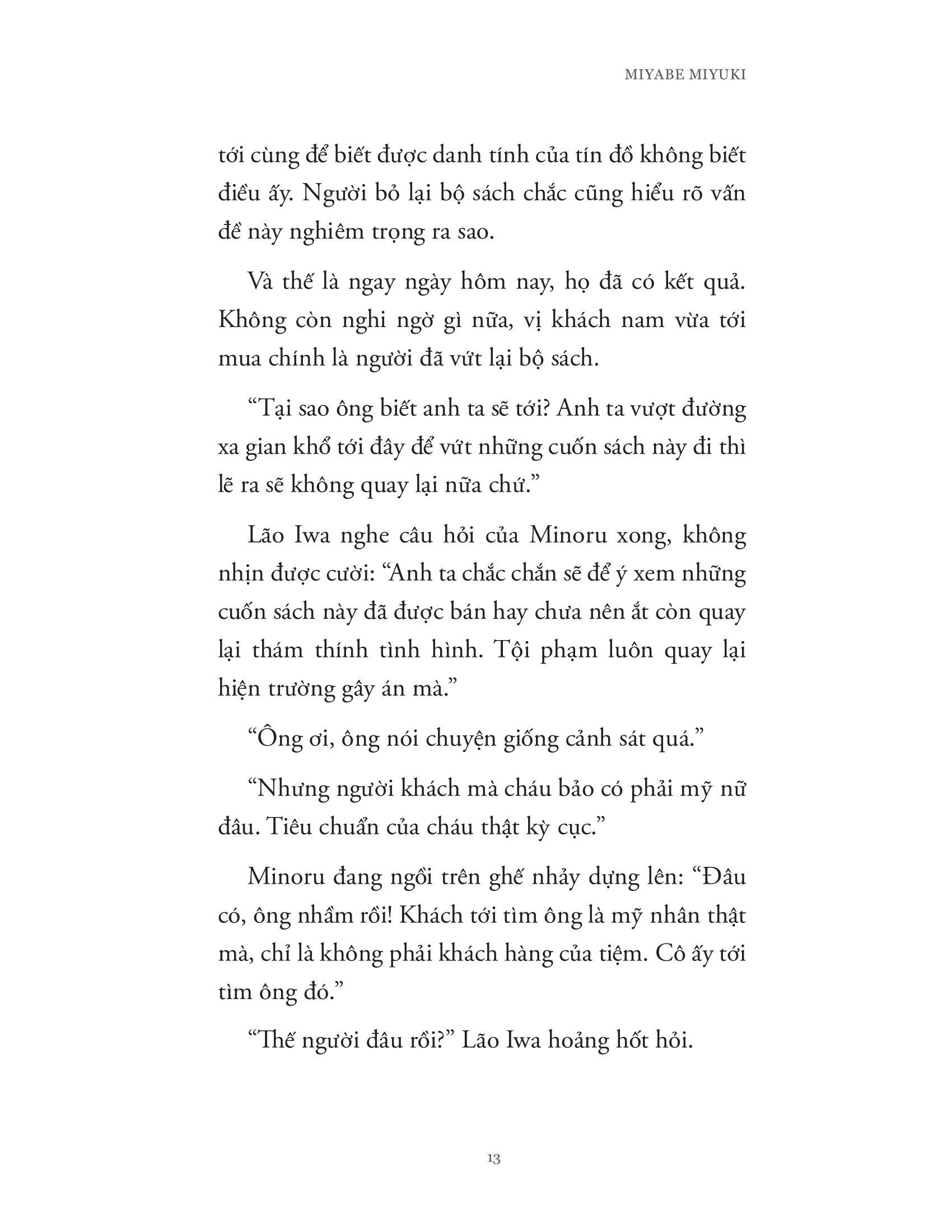 Tác giả Miyabe Miyuki sinh năm 1960 tại Tokyo, được biết đến như “Tác giả quốc dân của nền văn học Nhật Bản”. Sau khi ra mắt công chúng lần đầu vào năm 1987, bà tiếp tục viết sách và nhận được rất nhiều giải thưởng ở nhiều thể loại khác nhau như tiểu thuyết trinh thám, tiểu thuyết thời đại, tiểu thuyết giả tưởng… Bên cạnh đó, 11 năm liền bà được bầu chọn là “Tác giả nữ được yêu thích nhất” và được xem là “Kỳ tích của lịch sử văn học Nhật Bản”.