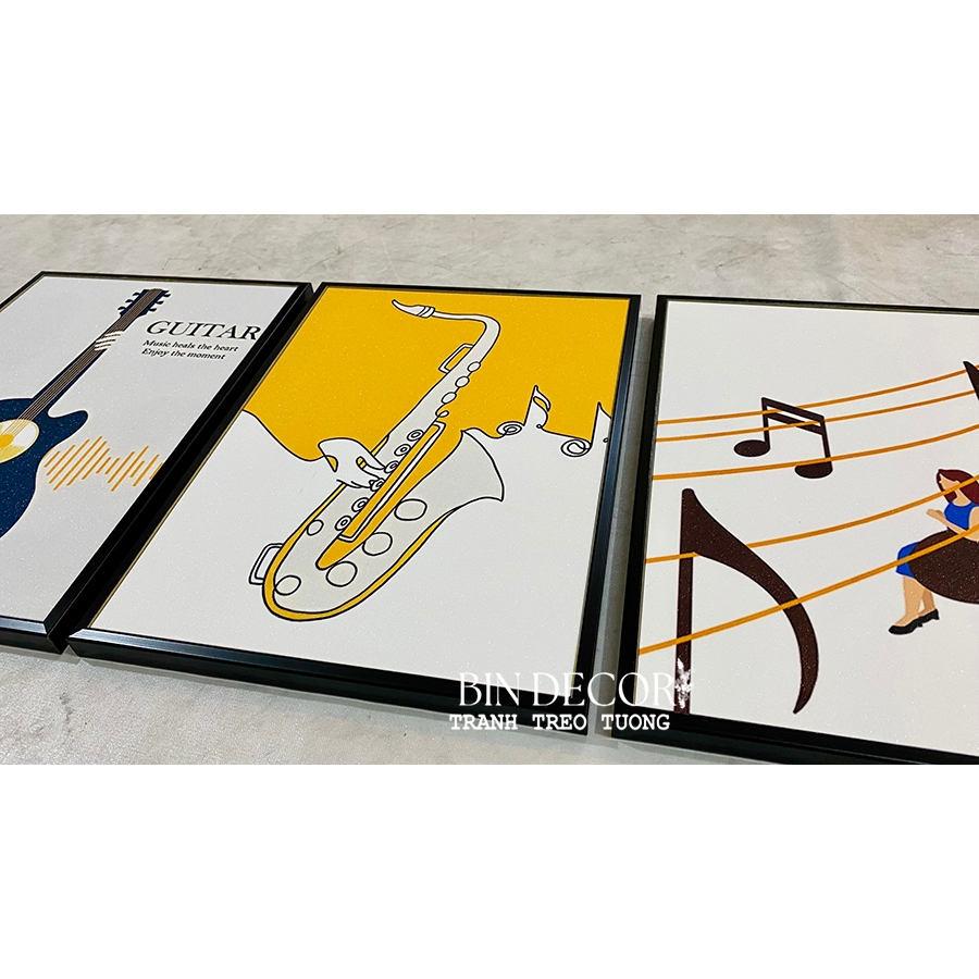 Tranh treo tường âm nhạc 24 - Kích thước của tranh : Kích thước : 25x35cmx3 tấm 30x45cmx3 tấm 40x60cmx3 tấm - Chất liệu : KIM SA - TRÁNG GƯƠNG - CANVAS - Khách hàng