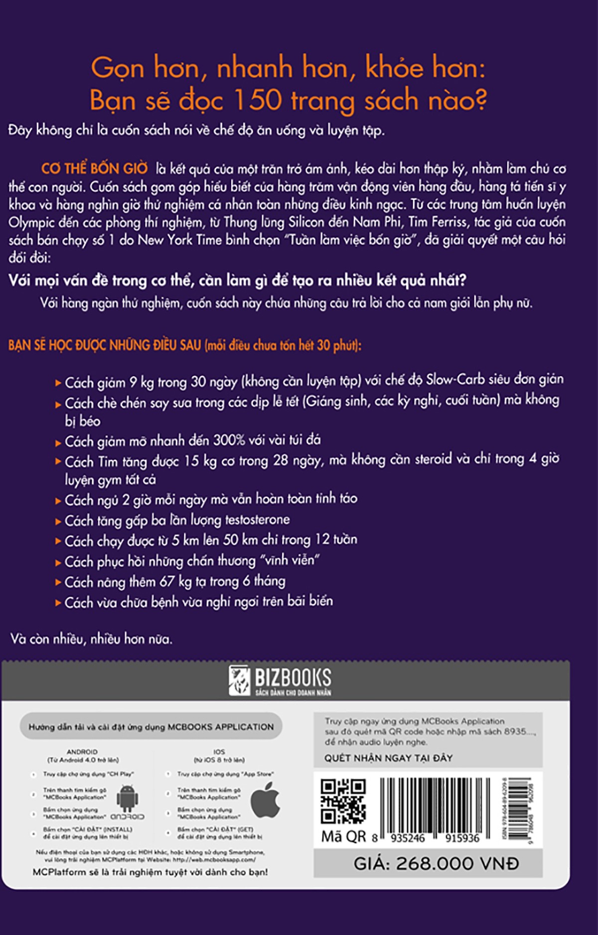Con người bạn sẽ trở nên hoàn thiện hơn, khỏe mạnh hơn bao giờ hết khi có phương pháp tập luyện, chế độ ăn uống khoa học. Những phương pháp thực nghiệm mà tác giá đưa ra sẽ là bài học tuyệt vời cho bất kỳ ai, đừng bỏ qua cuốn sách “Cơ thể 4 giờ” để có một cơ thể tuyệt nhất nhé .
