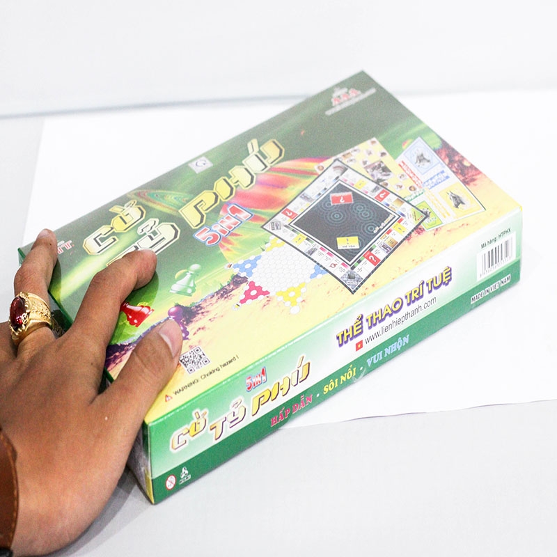 Cờ Tỷ Phú Hộp Xanh với 5 trò chơi hấp dẫn: Cờ tỷ phú, cờ nhảy, cờ cá ngựa, cờ thú và cờ đoán, được làm bằng giấy cao cấp, chất lượng in rõ nét, bền