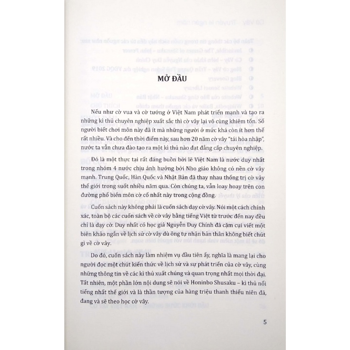 Từng có câu nói về cờ vây “围棋千古以来无同局 - vi kỳ thiên cổ dĩ lai vô đồng cục” – nghĩa là: kể từ xa xưa cho đến về sau, không có ván cờ vây nào giống nhau. Miêu tả khái quát đó đã cho thấy nét tương phản giữa hình thức và nội dung của cờ vây, tuy cách thức chơi cực kì đơn giản chỉ hai màu quân đen và quân trắng, nhưng tiềm ẩn nội dung phong phú, đa dạng trong chiến lược, chiến thuật… Không phải vô cớ, mà các nhà khoa học đã chỉ ra tác dụng của hoạt động chơi cờ vây là khiến cho cả hai bán cầu não của người chơi đều hoạt động và nhờ đó não bộ sẽ phát triển tốt trong quá trình chơi cờ. Những người tiếp xúc với bộ môn thú vị này đều không khỏi bị nó hấp dẫn, rồi dần dần sự tò mò và quan tâm đến nso sẽ tang dần theo năm tháng luyện cờ. Đối với những người nhập môn, còn gì tuyệt vời hơn một cuốn sách tổng hợp được tất cả những thông tin về lịch sử cờ vây, sự phát triển của cờ vây trên thế giới cũng như những sự kiện thú vị về các kì thủ trong quá khứ. Thông qua cuốn sách, người đọc sẽ cùng vén tấm màn phiêu lưu vào thế giới cờ vây – truyền kì ngàn năm Lời khuyên của Biên tập viên dành cho việc đọc cuốn sách Cuốn sách này dành tặng cho những người trẻ vẫn đang mê mải tìm kiếm những thông tin ít ỏi mà vô cùng thú vị về cờ vây – môn cờ huyền bí đã có lịch sử cả nghìn năm. Tuy có bề dày lịch sử tại các quốc gia đồng văn như Hàn Quốc, Trung Quốc và Nhật Bản nhưng đây lại là món ăn tinh thần còn khá mới mẻ tại Việt Nam hiện nay. Với lối viết rất gãy gọn, tổng hợp nội dung rất súc tích và dễ “thấm”, tác giả đã khéo léo mang đến cho người đọc một góc nhìn rất mới lạ về môn cờ tưởng chừng rất đơn giản mà đầy sức hấp dẫn này. Có thể nói, cuốn sách của anh là một cuốn sách không thể bỏ qua đối với những người nhập môn trò chơi này. Câu nói hay dành tặng bạn “Cuối cùng, việc tranh giành địa bàn trên bàn cờ cũng chẳng khác nào trên thương trường. Chỉ một quyết định sai lầm, bạn cũng có thể mất đi một đám quân lớn. Và khi bạn giành được tiên thủ, điều đó không khác gì bạn đi trước đối phương một bước để chiếm lĩnh lấy thị trường. Nhưng nếu nước đi đó không chính xác, cơ hội sẽ lại chuyển về tay kẻ khác.” Tác giả Vũ Hoàng Bản thảo tuyệt vời của Vũ Hoàng, một tác giả đã dành gần chục năm để tổng hợp và nghiên cứu về môn cờ vây. Tác giả cũng đã từng có nhiều bài viết trên blog cộng đồng nhằm nâng cao sự hiểu biết của mọi người về món ăn tinh thần này và nhận được rất nhiều sự ủng hộ và theo dõi của người chơi.