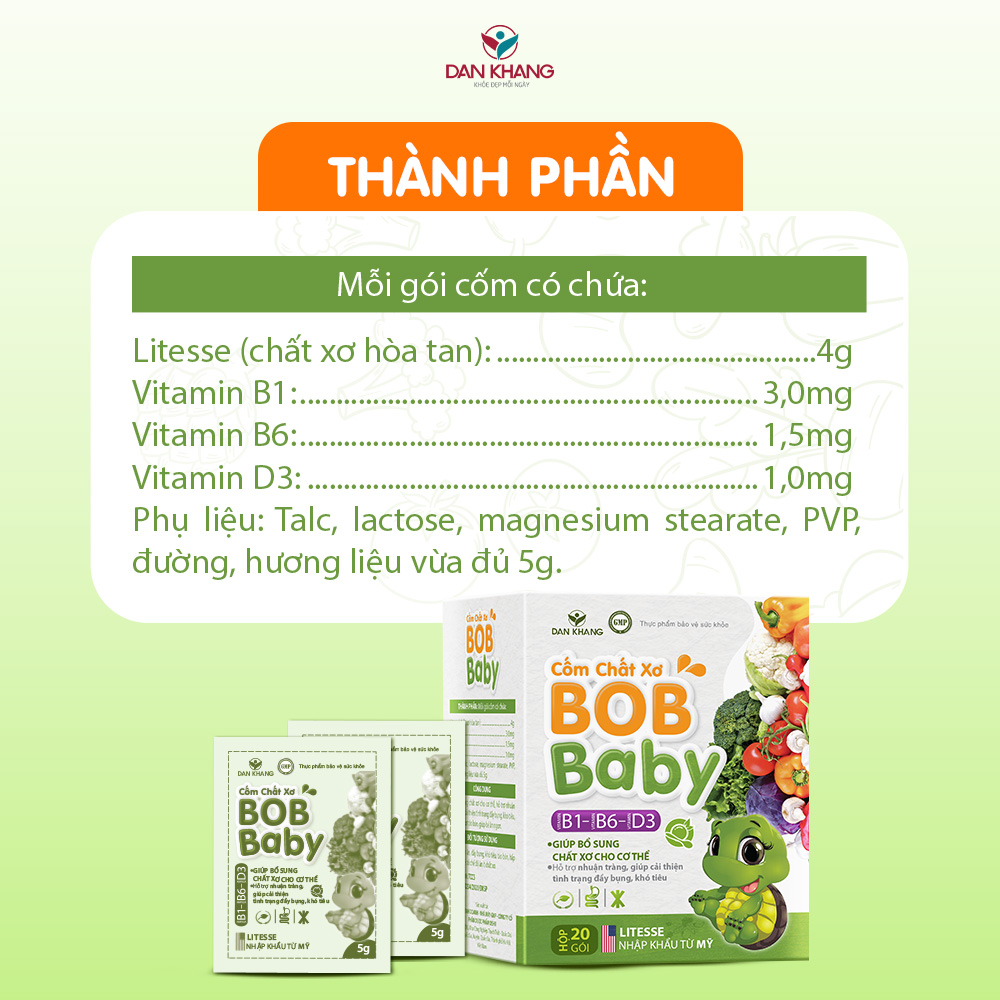 • Vitamin D3: 1mg Phụ liệu: Talc, lactose, magnesium stearate, PVP, đường, hương liệu vừa đủ 5g   Công dụng của Cốm Chất Xơ Bobbaby Giúp bổ sung chất xơ cho cơ thể, hỗ trợ nhuận tràng, giúp cải thiện tình trạng đầy bụng, khó tiêu, giảm nguy cơ táo bón, giúp bé ăn ngon.   Đối tượng sử dụng Cốm Chất Xơ Bobbaby Trẻ em chán ăn, đầy bụng, khó tiêu, táo bón, hấp thu kém. Trẻ có chế độ ăn ít xơ.   Cách dùng Cốm Chất Xơ Bobbaby