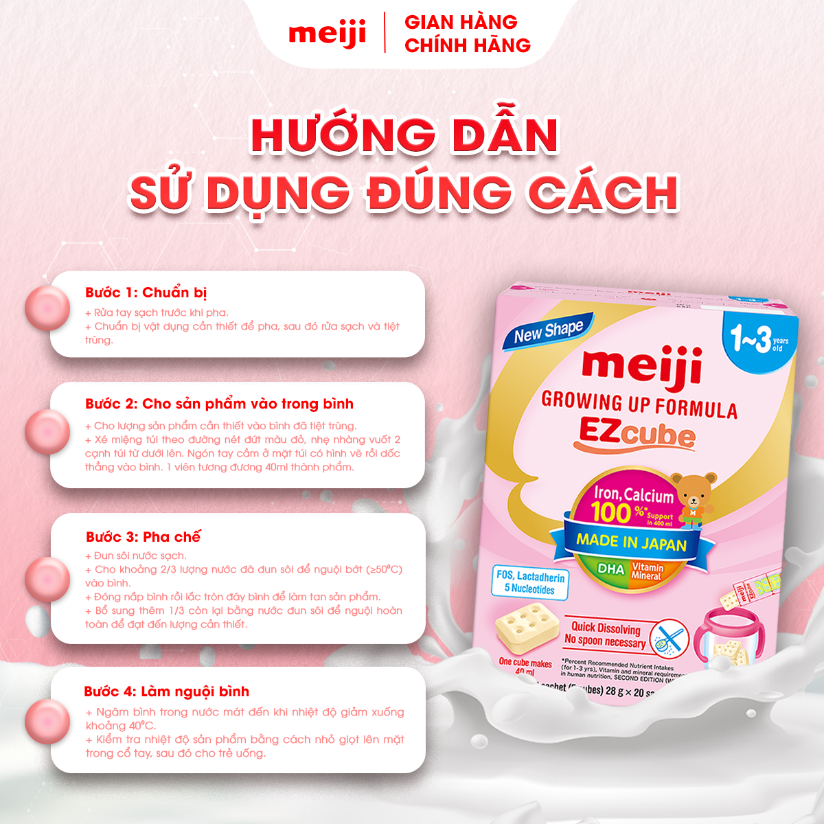 - Meiji Growing Up Formula EZcube là sản phẩm dạng viên, đóng gói trong hộp giấy hình hộp chữ nhật gồm 20 thanh/ hộp và 5 viên/ thanh, trọng lượng 560g. ĐẶC ĐIỂM SẢN PHẨM
