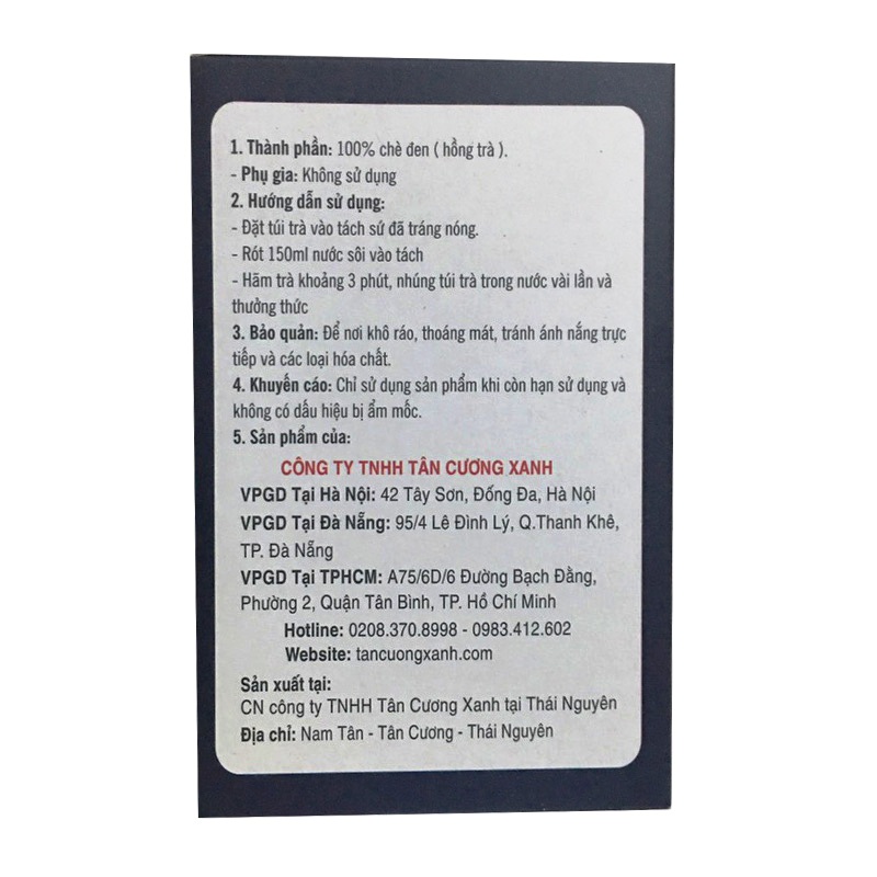 Trà Đen Túi Lọc - Tân Cương Xanh được làm bằng nguyên liệu trà đen nguyên chất. Giấy lọc sử dụng trong sản phẩm trà đen túi lọc là giấy lọc nhập khẩu Đức