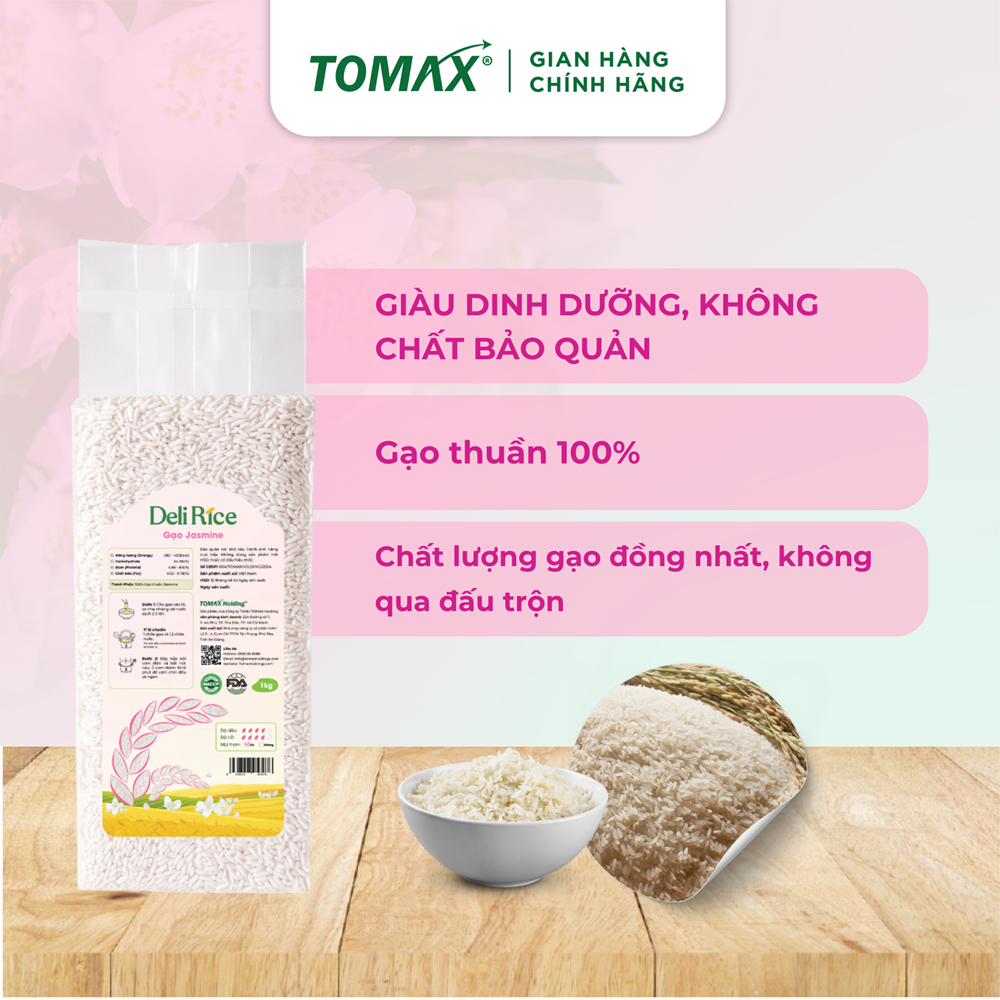 Gửi gắm tinh túy trong từng hạt gạo Jasmine canh tác hướng hữu cơ - Những hạt gạo to đều, trắng trong đẹp mắt, thơm thoảng hương lài cuốn hút. Khi nấu cho hạt cơm dẻo mềm, cơm ráo và hậu vị đậm đà, cho bữa cơm thêm ngon và an toàn cho sức khỏe. Gạo Jasmine Tomax được tuyển chọn kỹ lưỡng từ những vùng trồng lúa chất lượng, canh tác hoàn toàn tự nhiên, sử dụng 100% phân bón hữu cơ vi sinh do TOMAX liên kết sản xuất và phân phối. Đồng thời, sử dụng công nghệ sản xuất khép kín, hiện đại, mang đến khách hàng những hạt gạo tinh khiết, thơm ngon, đạt tiêu chuẩn quốc tế HACCP và FDA (Mỹ). Là loại lúa ngắn ngày, gạo Jasmine được trồng phổ biến và rộng rãi tại khu vực Đồng Bằng Sông Cửu Long - Nơi được thiên nhiên biệt đãi với tiết trời ôn hòa, phù sa màu mỡ. Nhờ đó gạo cho năng suất cao, phẩm gạo tốt và giá trị dinh dưỡng vượt trội. Gạo Jasmine thơm thoảng hương lài nhẹ nhàng, cuốn hút nên một số nơi cũng thường gọi là gạo thơm Jasmine, gạo thơm hương lài hoặc gạo thơm hoa nhài. Khi nấu cơm nở đều, dẻo mềm, nếu nhai kỹ sẽ có vị ngọt nhẹ, để nguội vẫn rất thơm ngon, ăn với món nào cũng đều hấp dẫn. Ngoài ra, gạo Jasmine có nhiều dưỡng chất có lợi cho sức khỏe như protein, vitamin B1, B2, niacin, vitamin E và các loại khoáng chất như: sắt, kẽm, kali, magie, canxi,… Với chất lượng tốt, mức giá phải chăng nên gạo Jasmine vừa được nhiều gia đình ưa chuộng cho bữa cơm sum vầy, vừa mang đến giá trị xuất khẩu cao, khẳng định vị thế gạo Việt trên thị trường quốc tế. TẠI SAO NÊN CHỌN GẠO JASMINE Tomax? Được canh tác hướng hữu cơ trên những cánh đồng chuyên biệt, màu mỡ Kiểm soát chất lượng nghiêm ngặt từ khâu gieo trồng đến thu hoạch, sản xuất, đóng gói đảm bảo tiêu chuẩn quốc tế HACCP, FDA Cam kết 100% gạo thuần: KHÔNG đấu trộn, KHÔNG dư lượng chất bảo vệ thực vật, KHÔNG tẩm các chất ảnh hưởng đến sức khỏe người tiêu dùng. Gạo luôn tươi mới, được tuyển chọn tỉ mỉ, đồng nhất về chất lượng và hương vị. Bao bì thiết kế đẹp mắt, tiện lợi và bảo quản tốt hơn. Dịch vụ chu đáo, tận tâm, giao hàng tận nhà và nhiều chính sách hậu mãi tố Hướng dẫn cách nấu cơm ngon với gạo Jasmine Tomax: Bước 1: Vo gạo nhẹ nhàng với nước sạch 2-3 lần. Cho gạo đã vo vào nồi cơm điện với tỉ lệ chuẩn 1 gạo và 1 nước (có thể điều chỉnh theo sở thích và khẩu vị) Bước 2: Đậy nắp và bật chế độ nấu. Khi cơm chín, nồi sẽ tự động chuyển sang chế độ giữ ấm. Ủ cơm thêm 10-15 phút để cơm chín đều và ngon hơn. Thông tin chi tiết gạo Jasmine ● Giá trị dinh dưỡng (trong 100g gạo): Năng lượng: 280 - 420 kcal Carbohydrate: 64-86% Đạm (Protein): 4.86 - 8.5% Chất béo: 0.52 - 0.78% ● Khối lượng tịnh: 2 Túi 1kg ● Hạn sử dụng: 12 tháng kể từ ngày sản xuất ● Bảo quản: Nơi khô ráo, tránh ánh nắng trực tiếp. ● Cảnh báo: Không sử dụng sản phẩm đã hết hạn sử dụng hoặc có dấu hiệu mốc.