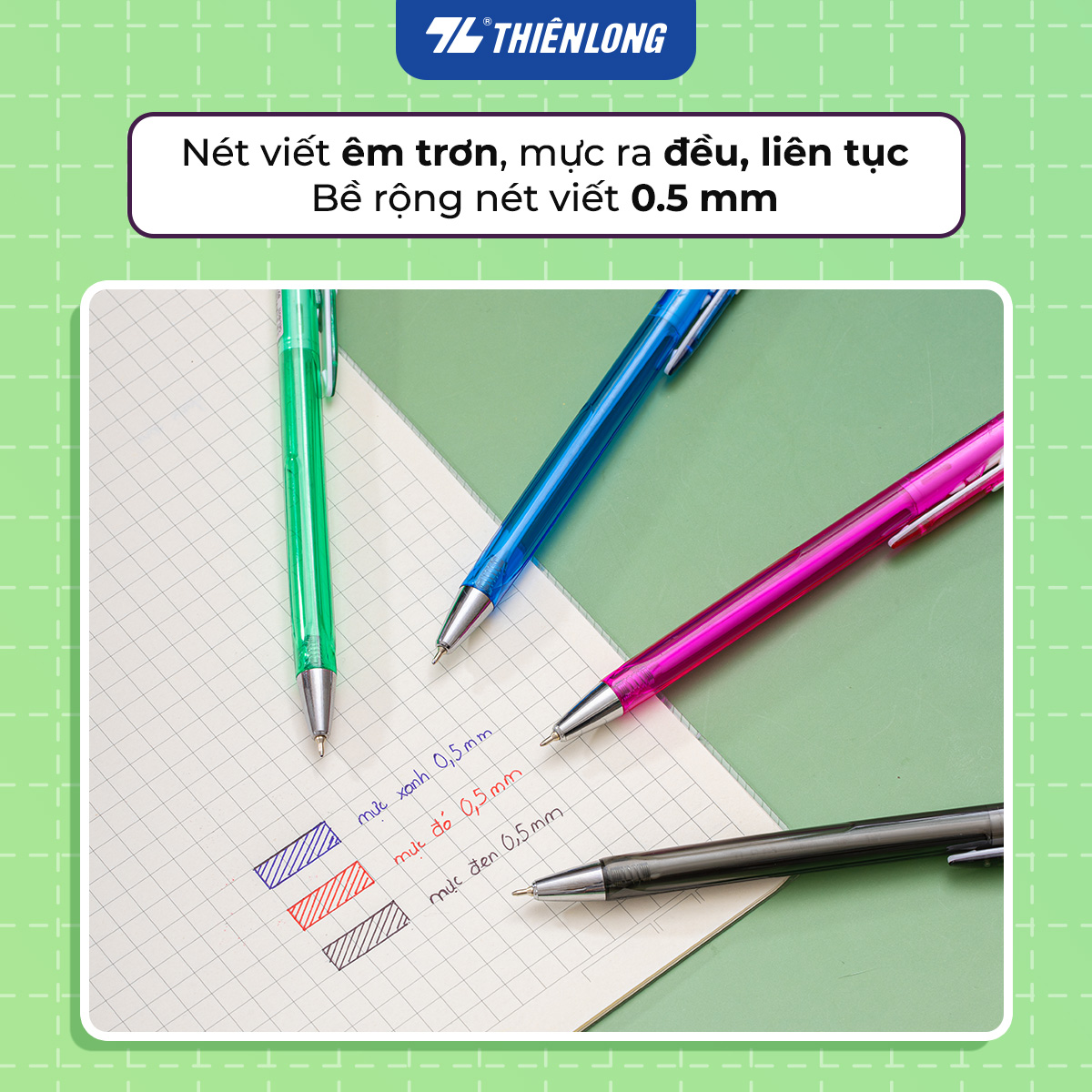 Thông số kĩ thuật : Tên danh mục Bút Gel Thương hiệu Thiên Long Đường kính viên bi 0.5 mm Màu mực Đen / đỏ / tím / xanh Trọng lượng 10 gram Tính năng
