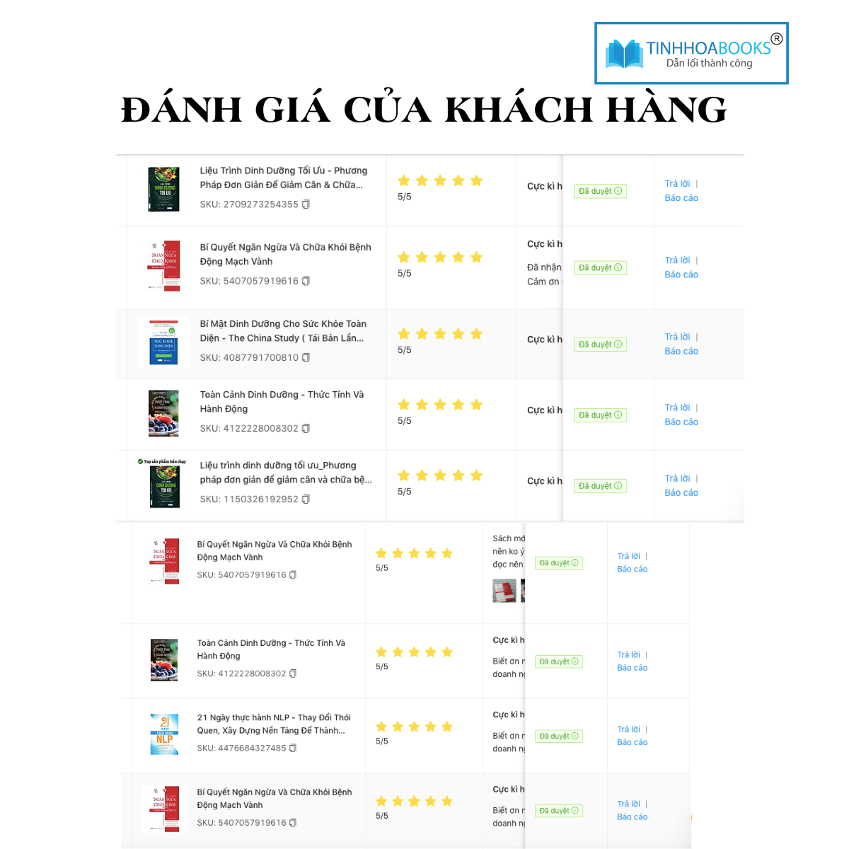 BÍ MẬT DINH DƯỠNG CHO SỨC KHỎE TOÀN DIỆN Một trong những cuốn sách dinh dưỡng gây chấn động toàn cầu, giúp bạn thay đổi cách ăn, chữa lành cơ thể, phòng ngừa bệnh mạn tính bằng chế độ ăn thực vật toàn phần (WFPB). Cuốn sách này dành cho ai? – Người đang tìm cách ăn uống lành mạnh nhưng hoang mang giữa vô vàn thông tin. – Người mắc bệnh mạn tính như tiểu đường, cao huyết áp, mỡ máu, gout, béo phì. – Người ăn chay, bán chay hoặc muốn chuyển đổi sang lối sống xanh. – Cha mẹ muốn nuôi con bằng dinh dưỡng không thuốc, không hóa chất. – Bất kỳ ai đang mệt mỏi, kiệt sức, rối loạn tiêu hoá hoặc lo lắng về sức khỏe tương lai. Vì sao nên đọc ngay cuốn sách này? ️ 20 năm nghiên cứu khoa học tại Đại học Cornell (Mỹ), Oxford (Anh) và Trung Quốc. ️ Vạch trần sự thật về protein động vật và ngành công nghiệp thực phẩm. ️ 8 nguyên tắc dinh dưỡng vàng để tự chủ sức khỏe, không phụ thuộc thuốc. ️ Dễ hiểu, có dẫn chứng khoa học rõ ràng, thay đổi tư duy từ gốc rễ. ️ Hơn 646 trang tri thức, giúp bạn hành động từng bước trong ăn uống và lối sống. Hiệu quả bạn có thể cảm nhận: – Giảm nguy cơ và cải thiện các bệnh mạn tính – Giảm cân tự nhiên, không cần nhịn ăn hay tập gym nặng – Cải thiện tiêu hóa, giấc ngủ, năng lượng và tinh thần – Hướng đến lối sống Whole Food Plant-Based, sạch, lành, không chế biến công nghiệp – Sống xanh, bảo vệ môi trường và tương lai thế hệ sau Thông tin sản phẩm: – Nhà xuất bản: Tinh Hoa Books – Số trang: 646 trang – Loại bìa: Bìa mềm – Ngôn ngữ: Tiếng Việt – Hình thức: In màu đẹp, giấy chất lượng cao – Tình trạng: Mới 100%, được đổi trả nếu hư hỏng do vận chuyển hoặc lỗi in ấn TOÀN CẢNH DINH DƯỠNG – THỨC TỈNH VÀ HÀNH ĐỘNG Cuốn sách “thức tỉnh” hàng triệu người về mối liên hệ giữa thực phẩm và bệnh tật. Nghiên cứu khoa học nền tảng giúp bạn ăn đúng, sống xanh, không phụ thuộc thuốc. Bạn có biết? Mỗi năm tại Việt Nam, hơn 115.000 người tử vong vì ung thư, 200.000 người chết vì tim mạch, và hơn 3,5 triệu người sống chung với tiểu đường. Nguyên nhân phần lớn không đến từ di truyền mà từ chế độ ăn uống hàng ngày! “Toàn cảnh Dinh dưỡng” của GS. T. Colin Campbell là công trình khoa học tầm cỡ thế giới, dựa trên hơn 20 năm nghiên cứu và Nghiên cứu Trung Quốc, nghiên cứu dịch tễ học lớn nhất từng thực hiện về mối liên hệ giữa thực phẩm và sức khỏe. Bạn sẽ học được gì từ cuốn sách này? ️ Dinh dưỡng chính là thuốc chữa lành: Bạn có thể phòng ngừa, thậm chí đảo ngược các bệnh mạn tính như tiểu đường, tim mạch, mỡ máu, gout, ung thư... mà không cần phụ thuộc thuốc. ️ Hiểu đúng về chế độ ăn Whole Food Plant-Based- thực vật toàn phần, sạch, không tinh chế giúp giảm cân tự nhiên, tăng năng lượng, ổn định đường huyết và mỡ máu. ️ Lật tẩy các ngộ nhận về protein động vật, sữa bò, chất béo, thuốc tây và ngành công nghiệp thực phẩm hiện đại. ️ Biến đổi tư duy, trao cho bạn quyền tự chủ sức khỏe, bắt đầu từ những gì bạn ăn mỗi ngày. Cuốn sách này dành cho ai? – Người đang mắc bệnh mạn tính hoặc muốn phòng bệnh từ gốc. – Người ăn chay, bán chay hoặc theo lối sống sạch, sống xanh. – Phụ huynh mong muốn nuôi con khỏe mạnh, không thuốc men. – Bất kỳ ai đang quan tâm đến ăn uống lành mạnh và sức khỏe chủ động. Thông tin sản phẩm: – Nhà xuất bản: Tinh Hoa Books – Số trang: 414 trang – Loại bìa: Bìa mềm – Ngôn ngữ: Tiếng Việt – Hình thức: In màu đẹp, giấy chất lượng cao – Tình trạng: Mới 100%, được đổi trả nếu hư hỏng do vận chuyển hoặc lỗi in ấn LIỆU TRÌNH DINH DƯỠNG TỐI ƯU Cuốn sách giúp bạn giảm cân bền vững, phòng và chữa bệnh không cần thuốc nhờ chế độ ăn thực vật toàn phần (WFPB). Bạn đã từng giảm cân nhưng lại tăng lại? Bạn đang mệt mỏi vì thuốc, thực phẩm chức năng, bệnh mạn tính, và muốn một giải pháp tự nhiên, bền vững? “Liệu Trình Dinh Dưỡng Tối Ưu” của BS. Thomas Campbell, đồng tác giả của cuốn “The China Study” chính là cẩm nang dinh dưỡng hiện đại bạn đang tìm kiếm. Điểm nổi bật của sách: ️ Dựa trên khoa học dinh dưỡng hiện đại, với các dẫn chứng thực tế từ hàng nghìn bệnh nhân đã cải thiện sức khỏe bằng chế độ Whole Food Plant-Based (WFPB). ️ Không cần thuốc, không cần nhịn ăn, không tốn kém, bạn vẫn có thể: – Giảm cân tự nhiên, không lo tăng lại – Phòng ngừa và hỗ trợ phục hồi tiểu đường, tim mạch, béo phì, gout... – Nuôi dạy con khỏe mạnh, không phụ thuộc thuốc bổ ️ Thực đơn áp dụng dễ dàng ngay tại nhà, không cần nguyên liệu đắt tiền  Nội dung hấp dẫn: Phần 1: Giải thích khoa học về ăn thực vật toàn phần (WFPB), phân nhóm thực phẩm, khái niệm “ăn đúng cách” Phần 2: Giải đáp tranh cãi nóng hiện nay, dầu ăn, đậu nành, đường, GMO, thực phẩm 