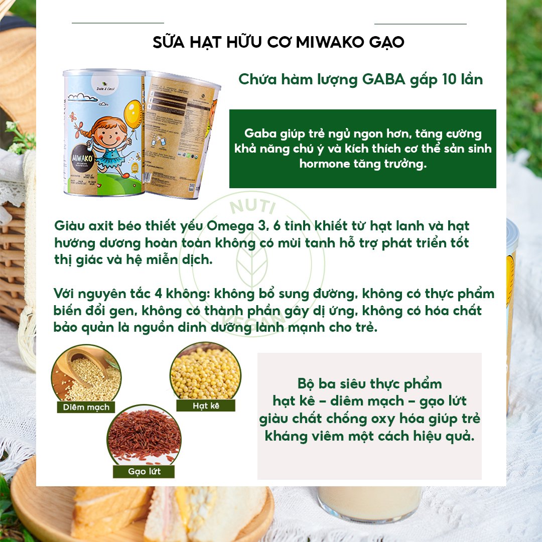 Mua tại TiktokCombo Hộp Sữa Hạt Miwako Vị Gạo Hộp 700g Malaysia, Sữa Thực Vật Hữu Cơ Dành Cho Bé Từ 1 Tuổi Dị Ứng Đạm Bò, Giảm Táo Bón Miwako vị gạo là dòng sữa sạch, thuần chay, hoàn toàn từ thực vật canh tác thuận tự nhiên và đối với một số nguyên liệu đạt chuẩn hữu cơ Mỹ USDA. Sử dụng công nghệ Nhật Bản tối ưu hàm lượng dinh dưỡng trong các loại hạt so với phương pháp nảy mầm thông thường. Sữa đem lại nguồn dinh dưỡng đầy đủ và an toàn cho cả gia đình. THÔNG TIN SẢN PHẨM SỮA HẠT HỮU CƠ MIWAKO VỊ GẠO: