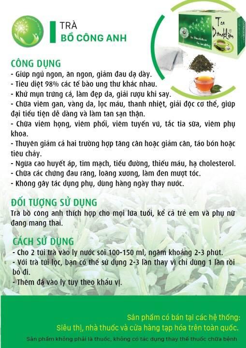 • Bạn sẽ thấy rõ hiệu quả của sản phẩm sau một thời gian sử dụng, sản phẩm Trà Bồ Công Anh sẽ làm bạn hài lòng.