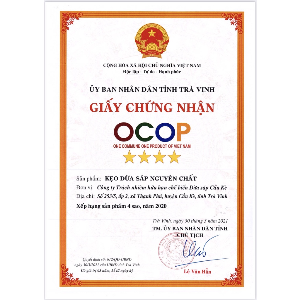 - Vị Lá Dứa: Nước cốt dừa (35%), Cơm Dừa Sáp (33%), Đường (20%), Mạch Nha (7%), Lá dứa tự nhiên (5%). Hướng Dẫn Sử Dụng: Sản phẩm ăn liền không cần chế biến, sử dụng tốt nhất ngay khi mở bao bì và không sử dụng sản phẩm quá hạn. Hướng dẫn bảo quản: Bảo quản nơi khô ráo, thoáng mát, tránh ánh nắng mặt trời trực tiếp. Hạn sử dụng: 08 tháng kể từ NSX