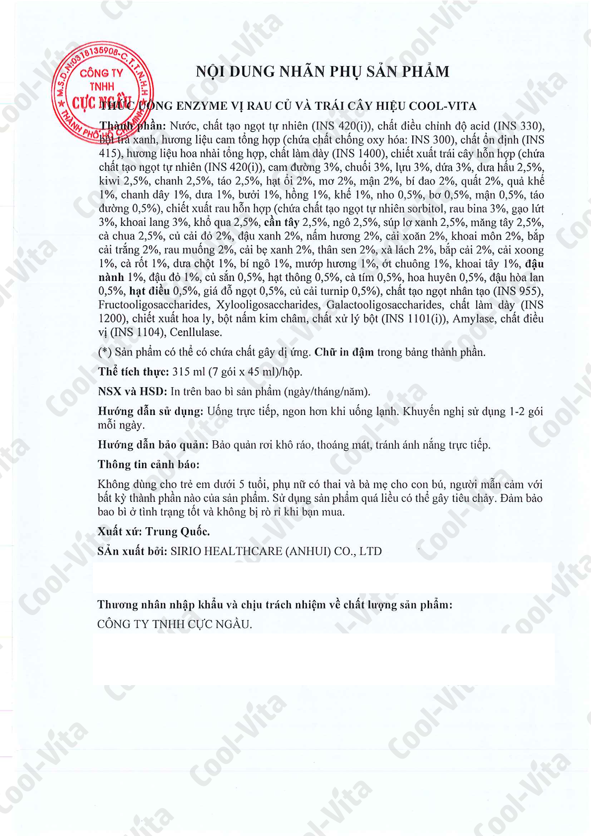 Nước Uống Enzyme Cool-Vita Chứa fructooligosacarit (FOS) galactooligosacarit (GOS), xylooligosaccharide (XOS) giúp tăng cường miễn dịch, tăng số lượng vi khuẩn tốt và tăng cường sức khỏe tiêu hóa.