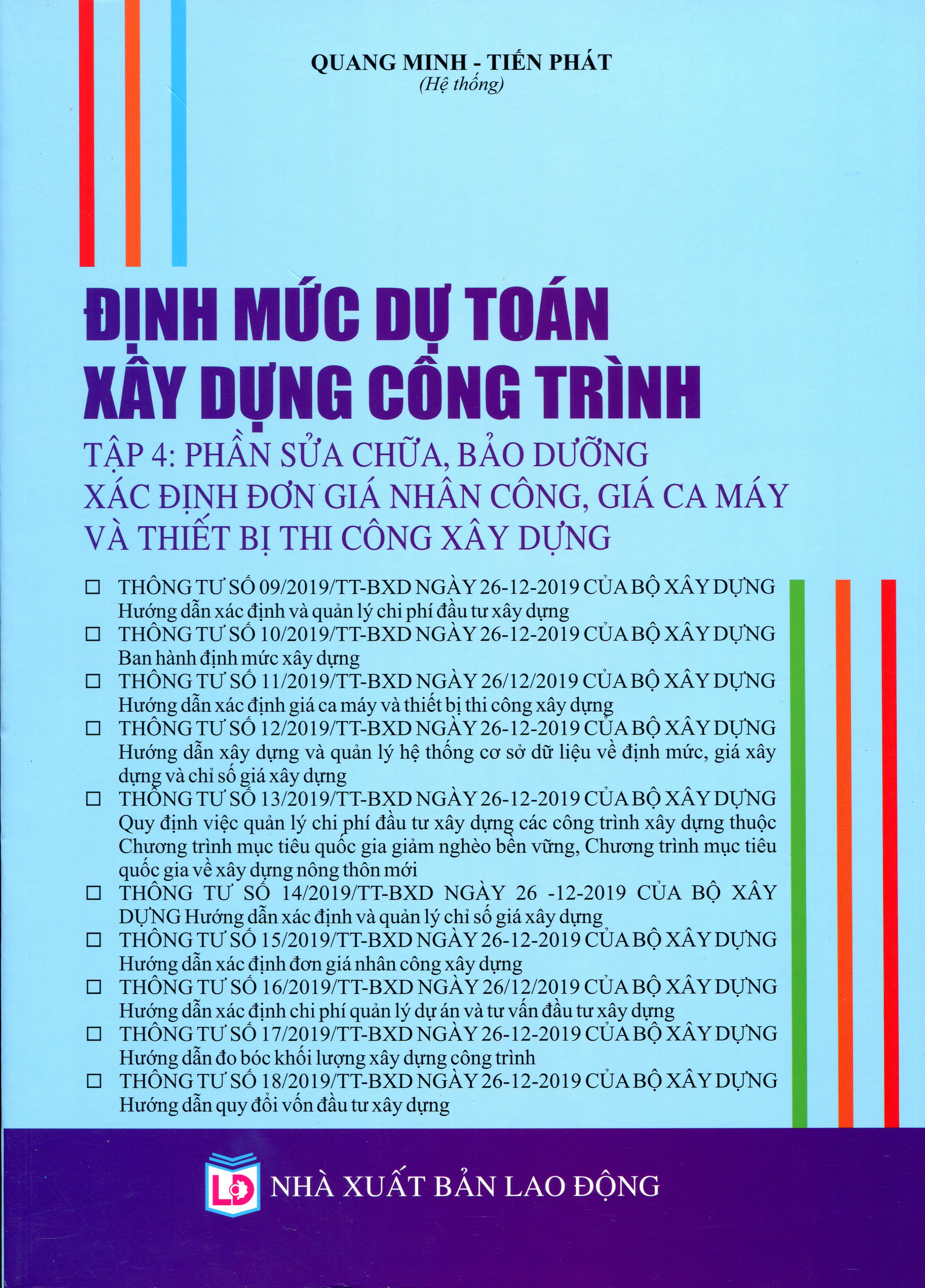 - Định mức sử dụng vật liệu xây dựng. Thông tư này cũng như các định mức kèm theo có hiệu lực áp dụng từ ngày 15 tháng 02 năm 2020. Định mức xây dựng ban hành kèm theo Thông tư 10/2019/TT-BXD để áp dụng vào việc xác định chi phí đầu tư xây dựng của các dự án sử dụng vốn ngân sách nhà nước, vốn nhà nước ngoài ngân sách và dự án đầu tư xây dựng theo hình thức đối tác công tư (PPP). Nhằm giúp bạn đọc nói chung, những người làm công tác xây dựng, các cơ quan, tổ chức, cá nhân có liên quan tham khảo, sử dụng vào việc lập và quản lý chi phí đầu tư xây dựng công trình, Nhà xuất bản Lao động cho xuất bản; “BỘ ĐỊNH MỨC DỰ TOÁN XÂY DỤNG CÔNG TRÌNH “ (gôm 4 tập)cập nhật từ Thông tư ;09,10, 11, 12,13,14,15,16,17 đến thông tư18. Những tập định mức cụ thể như sau: TẬP 1: ĐỊNH MỨC DỰ TOÁN XÂY DỰNG CÔNG TRÌNH - PHẦN XÂY DỰNG ( giá bìa 465,000) TẬP 2: ĐỊNH MỨC DỰ TOÁN XÂY DỰNG CÔNG TRÌNH - PHẦN KHẢO SÁT - THÍ NGHIỆM - SỬ DỤNG VẬT LIỆU XÂY DỰNG (giá bìa 395,000đ) TẬP 3: ĐỊNH MỨC DỰ TOÁN XÂY DỰNG CÔNG TRÌNH - PHẦN LẮP ĐẶT - giá bìa 390,000đ TẬP 4: ĐỊNH MỨC DỰ TOÁN XÂY DỰNG CÔNG TRÌNH - PHẦN SỬA CHỮA BẢO DƯỠNG, XÁC ĐỊNH ĐƠN GIÁ NHÂN CÔNG, GIÁ CA MÁY VÀ THIẾT BỊ THI CÔNG XÂY DỰNG - (giá bìa 398,000đ Sách in với hình thức đẹp, khổ 20 x28cm, độ dày 4 tập khoảng 1,900 trang, phát hành quý 1/2020