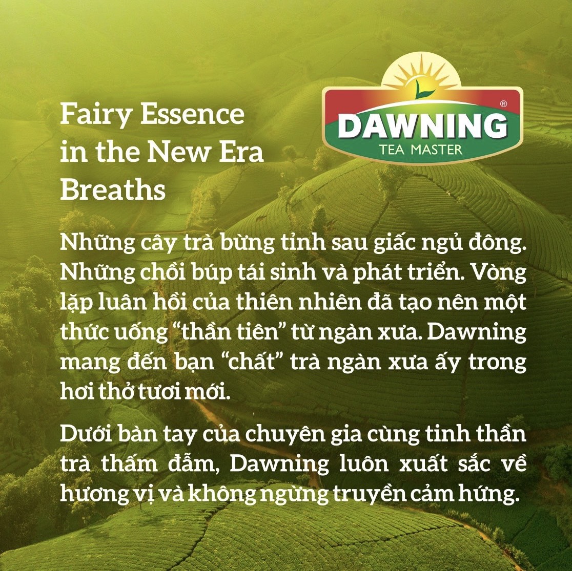 Trà là thức uống “thần tiên” lâu đời có ảnh hưởng và quyền lực khắp thế giới. Dawning là câu chuyện độc đáo về một thương hiệu trà Việt Nam, mang hồn cốt trà xưa trong hơi thở tươi mới. Dưới bàn tay của chuyên gia có tinh thần trà thấm đẫm, Dawning luôn xuất sắc về hương vị và mang đến nguồn cảm hứng bất tận.