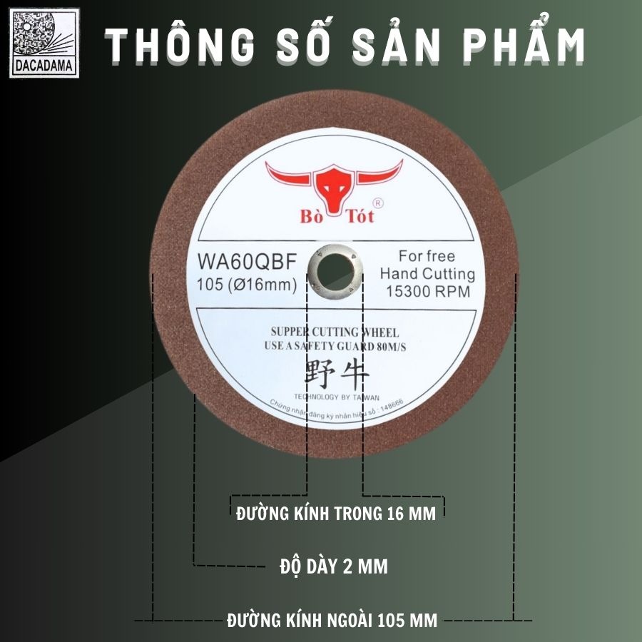 THÔNG TIN SẢN PHẨM: ️ Mã sản phẩm: BOTO1051 ️ Chất liệu : Hạt mài + Chất kết dính tổng hợp ️ Đường kính ngoài : 105 mm ️ Đường kính lỗ cốt : 16 mm ️ Độ dày : 1 mm ️ Số lượng: 1 viên ️ Thương hiệu : BÒ TÓT ️ Sản xuất : Việt Nam Đá cắt Bò tót là sản phẩm cao cấp trên thị trường với các thương hiệu đá cắt hiện nay, sản phẩm được tin dùng ở đa phần là khách hàng cá nhân, cơ sở sản xuất nhỏ lẻ bởi thiết kế siêu mỏng nhưng lực cắt rất bén, bề mặt cắt sản phẩm đẹp tạo nên tính thẩm mĩ hơn cho các nguyên liệu và khâu chế tác sản phẩm – Thiết kế sản phẩm đá cắt Bò tót vừa đơn giản vừa tiện lợi, giúp khách hàng dễ dàng đọc thông tin trên nhãn hiệu: ký hiệu bảo hộ,... ƯU ĐIỂM SẢN PHẨM: