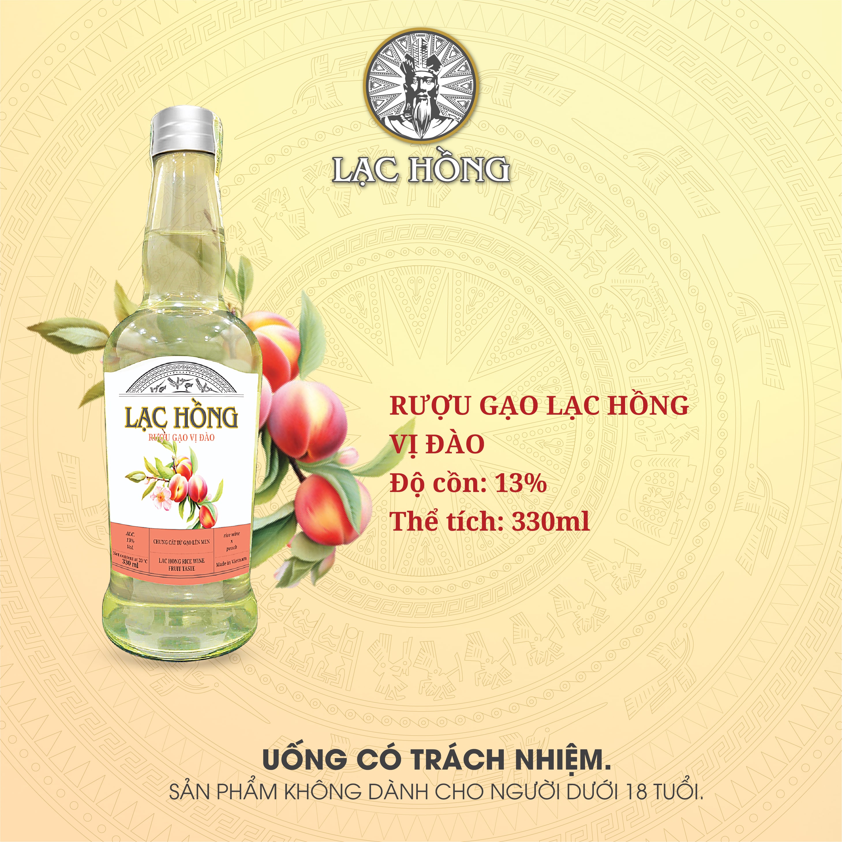 Rượu gạo Lạc Hồng vị Đào (13%) Rượu gạo Lạc Hồng vị Đào kết hợp hương vị ngọt ngào của đào cùng rượu gạo Việt Nam, tạo nên một thức uống nhẹ nhàng, dễ thưởng