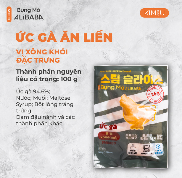 Chỉ cần 2 phút mở gói và hâm nóng ức gà đã được cắt lát và nêm nếm sẵn là bạn đã thưởng thức bữa ăn lành ngon, tiện lợi. Thịt gà vẫn tươi nhờ giữ được độ mềm thơm đậm vị trong từng thớ thịt vẹn nguyên dưỡng chất.