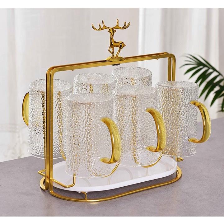 Combo Bộ 6 cốc thủy tinh cao cấp kèm giá úp tròn có khay hứng Combo gồm: 1 bình 6 cốc cốc 1 giá úp hươu 1 khay vương miện