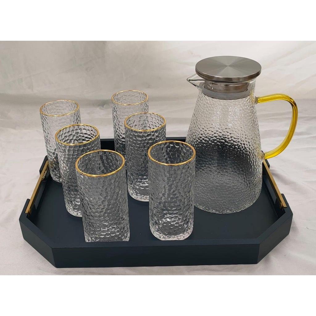 Bộ bình thuỷ tinh chịu nhiệt màu vàng gôn kèm 6 cốc phong cách Bắc Âu tạo ra một cảm giác sang trọng và vô cùng hiện đại
