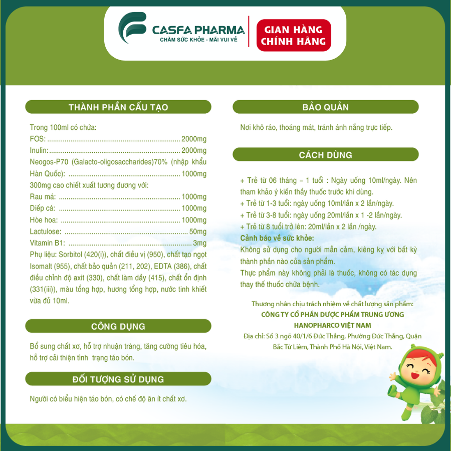 Thành phần: Inulin, Cây diếp xoăn, Chiết suất sung, Chiết xuất quả me, đại hoàng... Công dụng: Bổ sung chất xơ, giúp nhuận tràng, hạn chế táo bón, kích thích tiêu hóa... 1. THÀNH