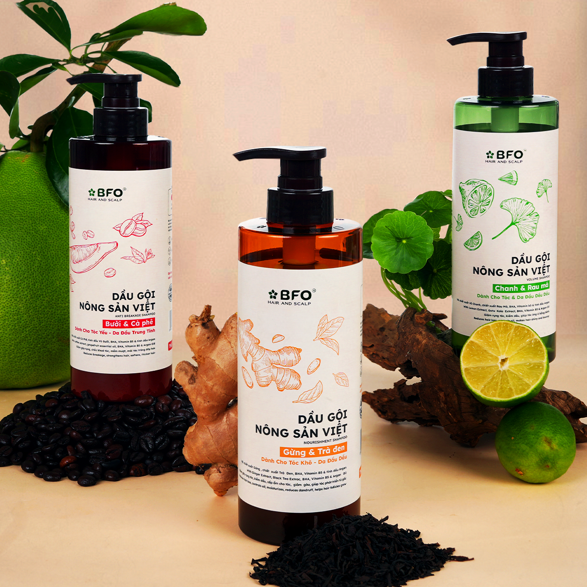 Dầu gội – Dầu xả Nông Sản Việt kết hợp chiết xuất bưởi, chanh, cà phê, gừng, rau má, trà đen – những nông sản quen thuộc, giàu dưỡng chất, giúp làm sạch tóc dịu