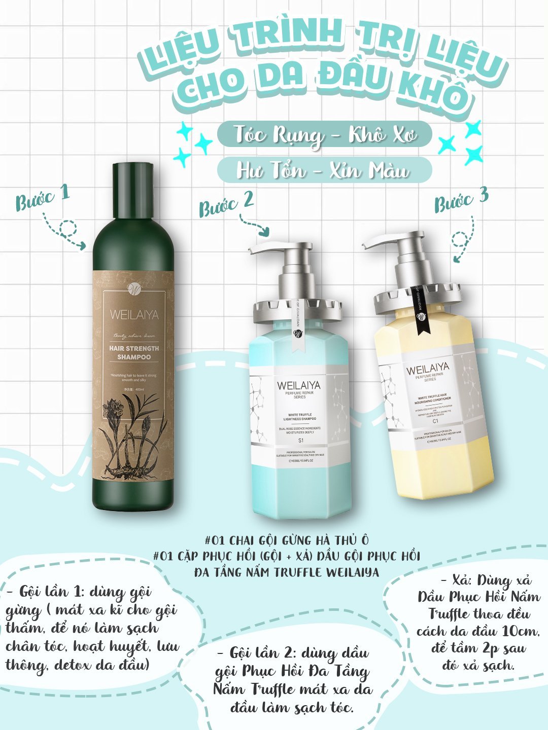 Lưu ý: Nên sử dụng kết hợp dầu gội và dầu xả Weilaiya để đạt hiệu quả tốt nhất