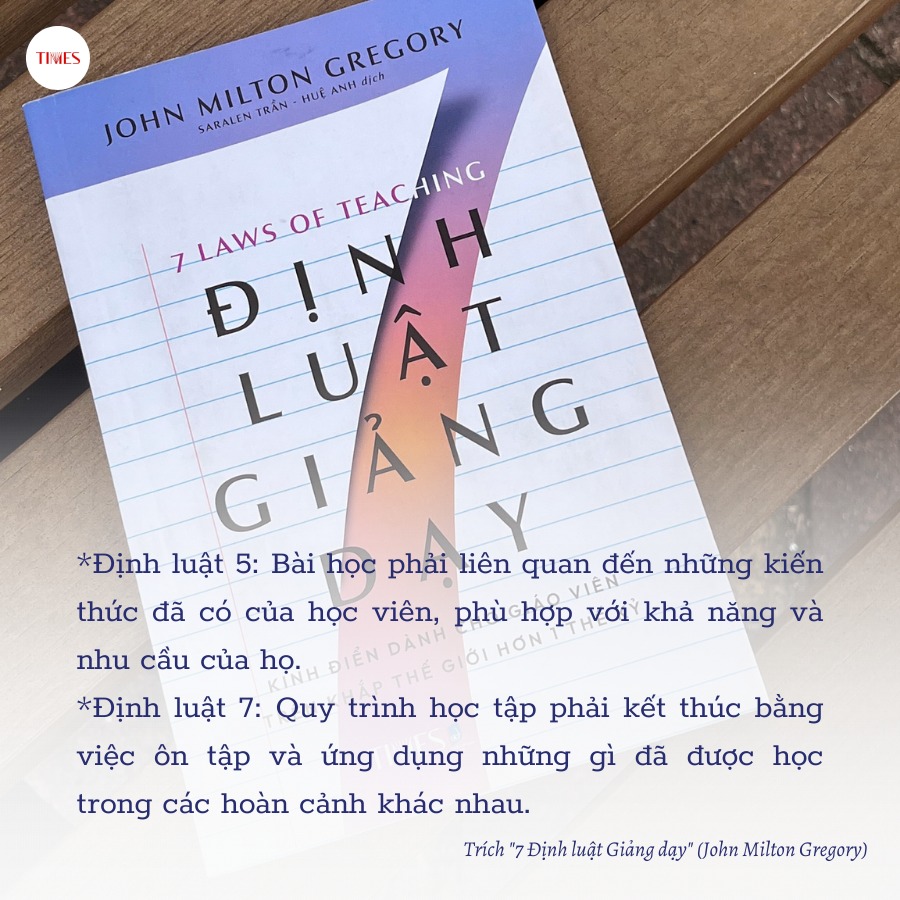 7 ĐỊNH LUẬT GIẢNG DẠY Xuất bản từ năm 1886, tác phẩm này là kinh điển cho các nhà giáo thuộc mọi bậc học trên khắp thế giới suốt hơn 1 thế kỉ qua. John Milton Gregory truyền đạt nghệ thuật giảng dạy thông qua bảy định luật và được trình bày rõ ràng, chi tiết giúp chúng ta dễ dàng ghi nhớ: