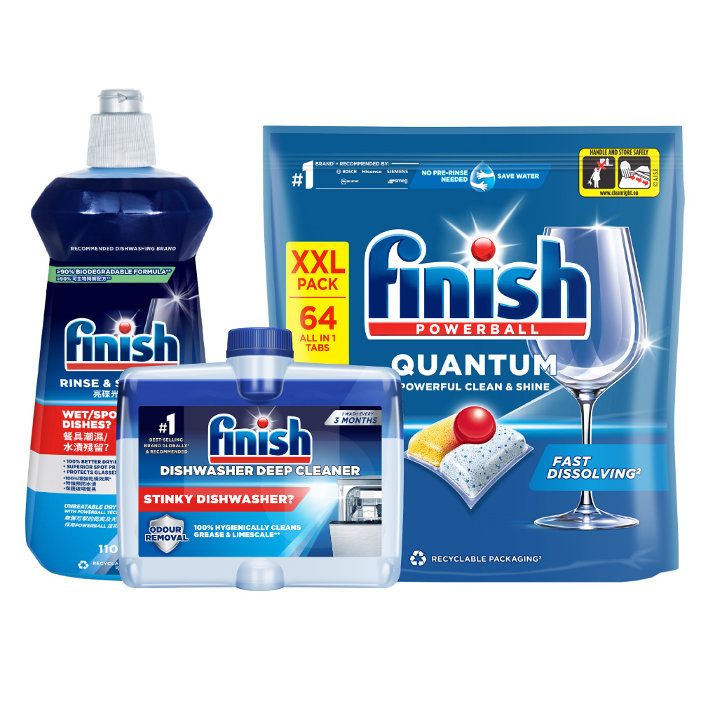 Combo Finish toàn diện 3: Viên Rửa Chén Bát Finish Powerball Quantum 64 viên + Nước Làm Bóng Finish 500ml + Muối Rửa Chén Finish Salt túi 1kg + Dung dịch vệ sinh máy Combo