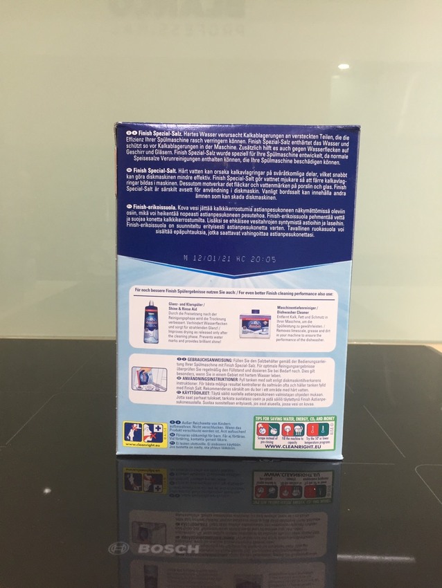 Đừng quên rằng máy rửa chén của bạn được trang bị một buồng trao đổi ion đặc biệt làm giảm độ cứng của nước và ngăn ngừa sự tích tụ chất vôi. Nó nên được thường xuyên nạp lại bằng Finish Protective Coating , bảo vệ máy rửa chén, bộ lọc và máy giặt cũng như các món ăn và dao kéo