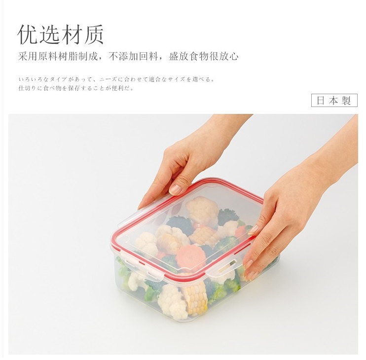 Hộp thực phẩm chữ nhật Inomata được làm bằng chất liệu nhựa PP cao cấp, kết hợp hoạt chất CEM-Bio kháng khuẩn, không chứa BPA, chịu được nhiệt độ từ -20 đến 140 độ C, không sản sinh ra các hoạt chất gây hại trong quá trình sử dụng. Sản phẩm đạt tiêu chuẩn chất lượng của FDA (Cục quản lý Dược phẩm và Thực phẩm Hoa Kỳ), sử dụng an toàn trong tủ lạnh, tủ đông và lò vi sóng. Sản phẩm có nắp khóa 4 chiều xung quanh chắc chắn vừa khít với gioăng silicone bảo đảm kín hơi và chống tràn không bị bay mùi thực phẩm, giữ vị tươi ngon cho thực phẩm khi bảo quản trong tủ lạnh, tủ đông tránh ám mùi sang những thực phẩm khác trong tủ. Hộp trong suốt dễ dàng quan sát tình trạng thực phẩm ở bên trong Sản phẩm có thể sử dụng để đựng & bảo quản thực phẩm trong tủ lạnh như các món dưa muối, dưa góp và các loại hạt, đồ khô, gia vị hoặc dùng để đựng thực phẩm thịt, cá dự trữ cho những chuyến dã ngoại, picnic, tạo sự tiện lợi tối đa cho người dùng.