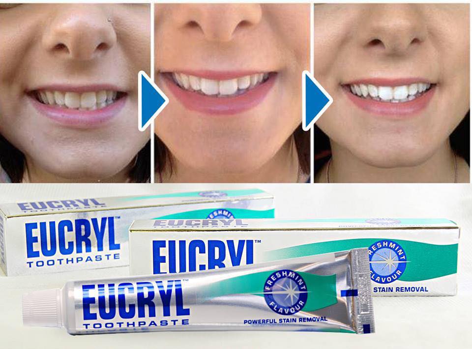 - Bột tẩy trắng răng Eucryl Tooth Powder và Kem đánh răng Eucryl hương bạc hà the mát với các viên bột li ti sẽ đi sâu vào kẽ răng của bạn, lấy đi những mảng bám do đồ ăn để lại, giúp răng trắng sáng hơn các loại kem đánh răng thông thường. Sản phẩm giúp chống hình thành cao răng, giúp bạn có hàm răng trắng sáng và hơi thở luôn thơm mát.