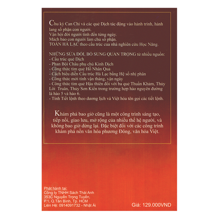 Những sửa đổi, bổ sung quan trọng từ nhiều nguồn: Cấu trúc quẻ Dịch Phan Bội Châu phụ chú Kinh Dịch Công thức tìm quẻ Hỗ Nhân Quả Cách biểu diễn Cấu trúc Hà Lạc bằng Hệ số nhị phân Công thức mới tính vận tháng, vận ngày Công thức tìm quẻ Hậu thiên đối với ba quẻ Thuần Khảm, Thủy Lôi Truân, Thủy Sơn Kiển trong trường hợp hào nguyên đường là hào 5 và hào 6. Tính Tiết lệnh theo dương lịch và Việt hóa tên gọi các tiết lệnh.