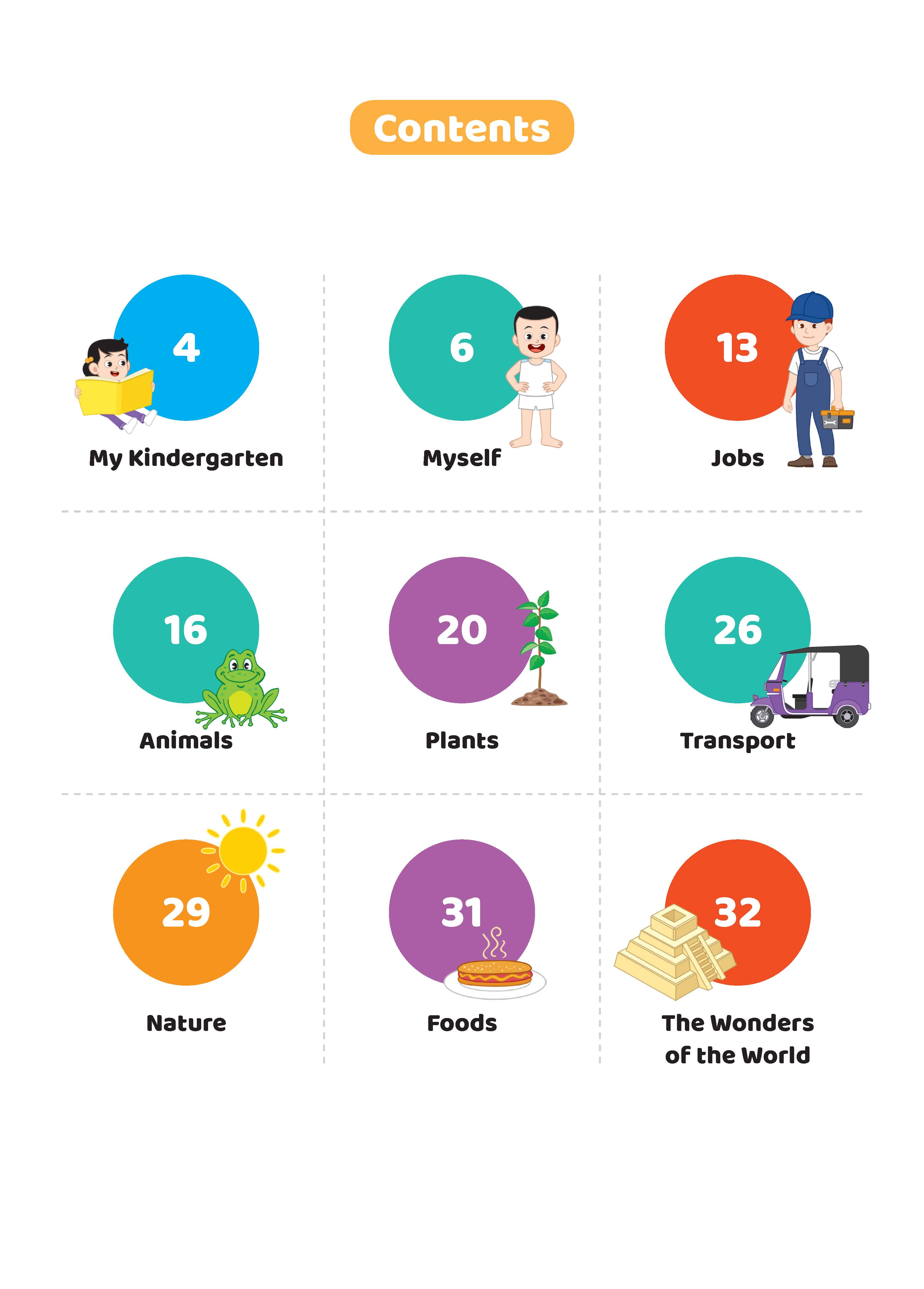 Exploring the World Around Us bao gồm các chủ đề như động vật, thực vật, giao thông, nhà cửa & gia đình cũng như nghề nghiệp.