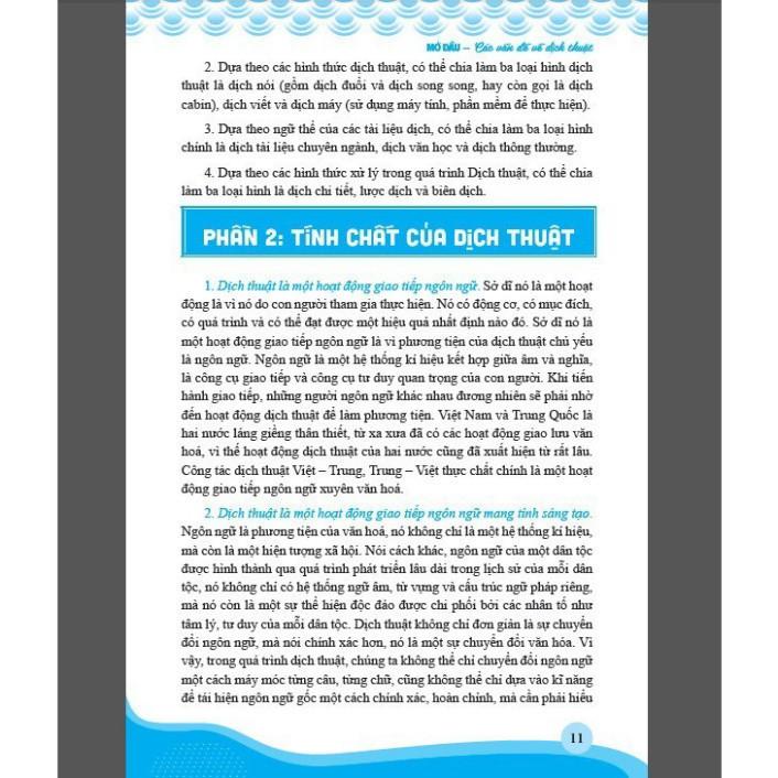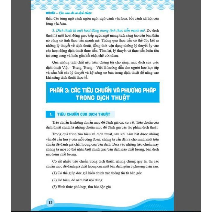 • Giáo trình gồm cả hai kỹ năng biên dịch và phiên dịch. Các kỹ năng được phân bổ cân đối, đồng thời trang bị cho người học năng lực biên và phiên dịch. - Giáo trình dịch hai chiều Trung – Việt và Việt – Trung. Các nội dung lý thuyết và bài tập chú trọng cả 2 ngôn ngữ, qua đó g