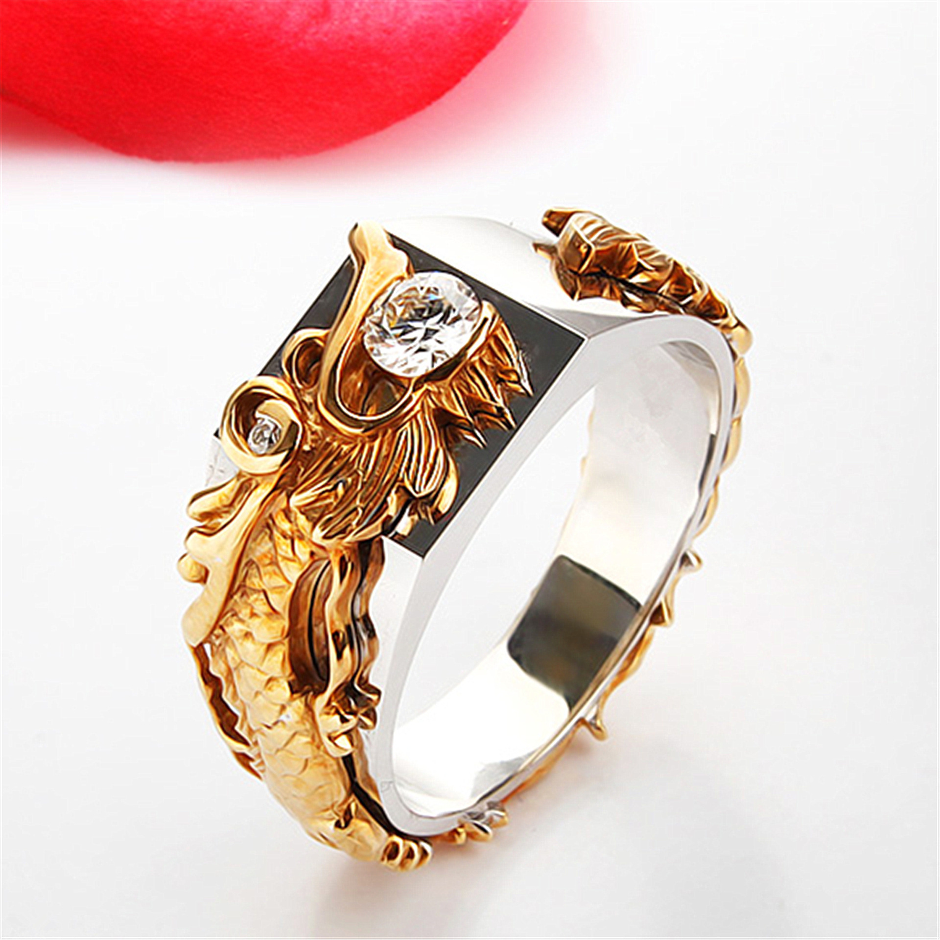 Chất liệu Thân Nhẫn: Hợp kim Titanium Chất liệu đá: Đá Zircon nhân tạo, kiểu dáng kim cương Thiết kế: Khắc rồng trên thân và mặt nhẫn, tinh xảo, chi tiết. Công dụng: Trang sức,