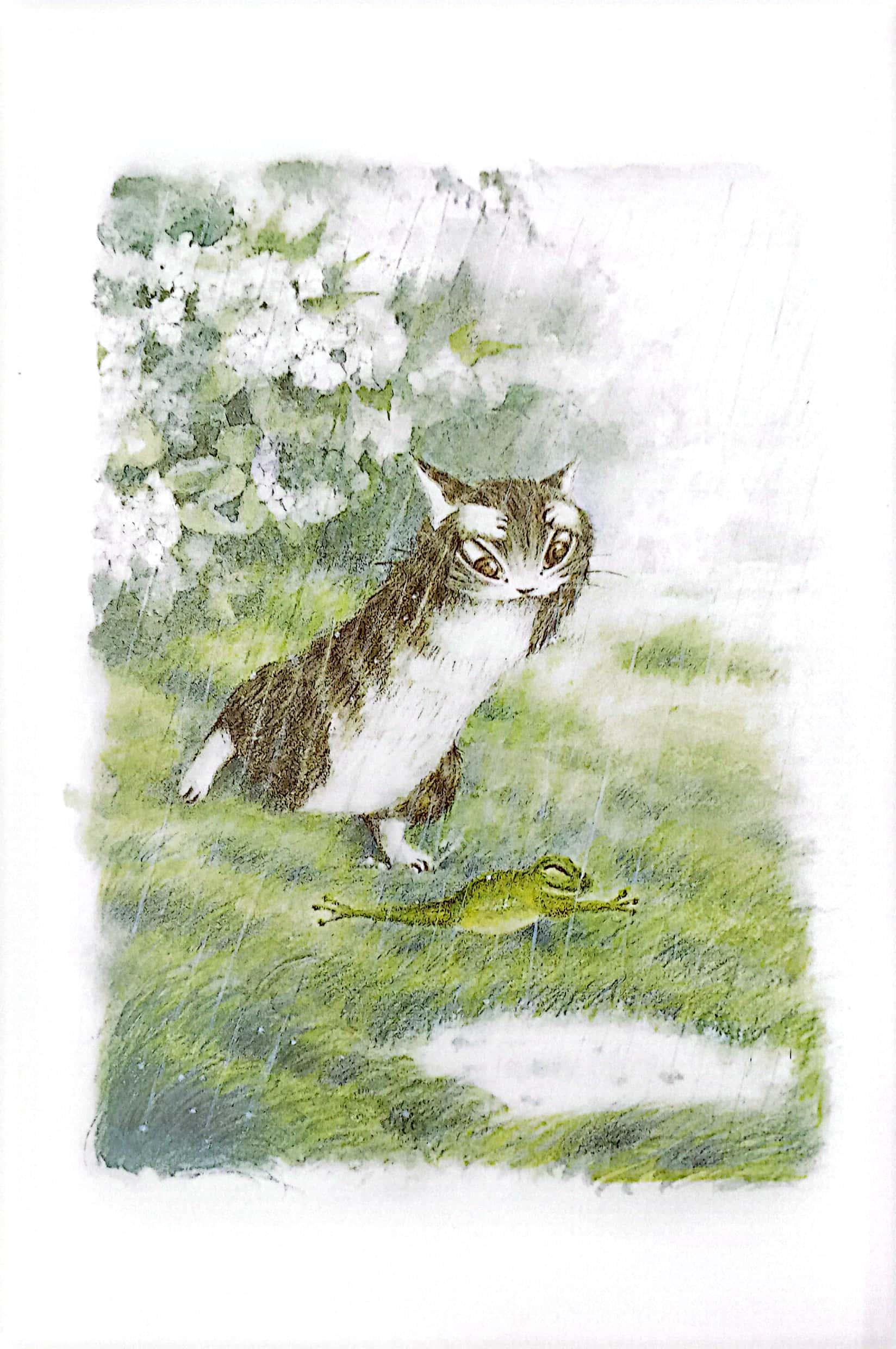 Mưa lất phất rồi trở nên xối xả, Dayan vội vàng tìm chỗ trú. Thế rồi cậu gặp được một chú ếch xanh vô cùng thích mưa.